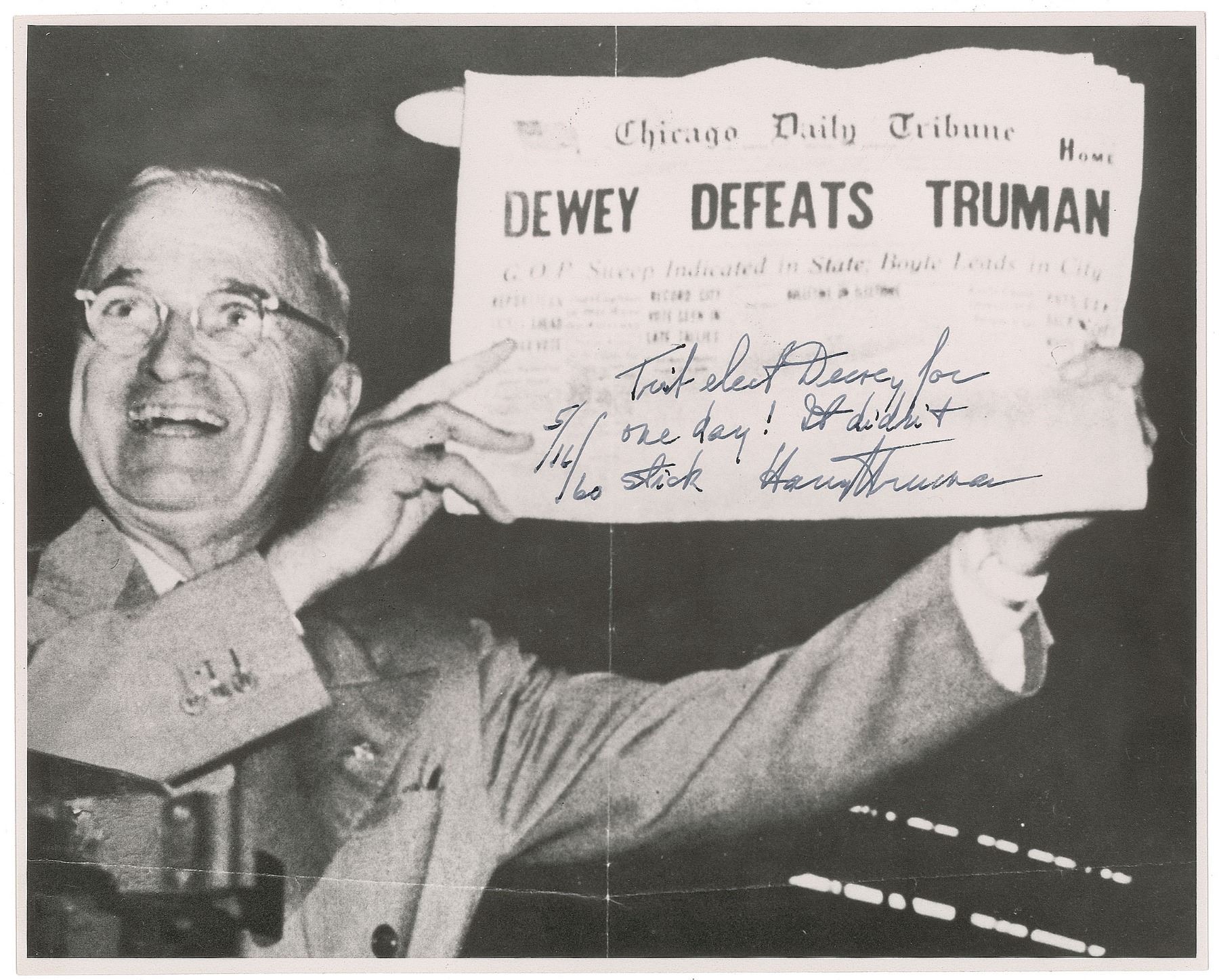 Choice matte-finish 9.5 x 7.75 photo of Truman holding up the iconic 'Dewey Defeats Truman' issue of the Chicago Tribune, signed in fountain pen, "Trib elect Dewey for one day! It didn't stick. Harry S. Truman, 5/16/60." In very fine condition.