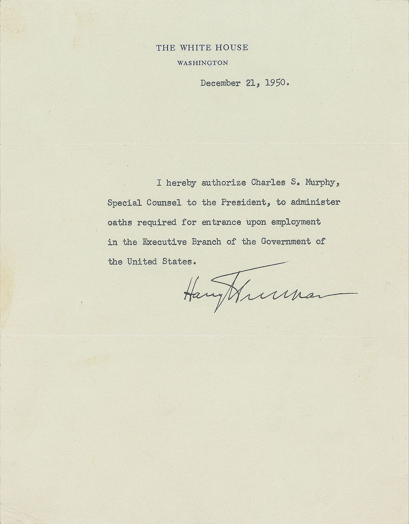 Unusual DS as president, one page, 6.75 x 8.75, White House letterhead, December 21, 1950. Official typed authorization document, in full: "I hereby authorize Charles S Murphy, Special Counsel to the President, to administer oaths required for entrance upon employment in the Executive Branch of the Government of the United States." In fine condition, with a light stain to the left edge, and light creasing to the corners. Accompanied by an unsigned engraved portrait.