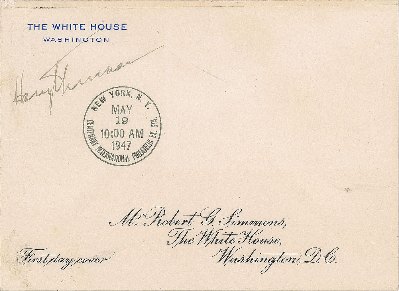 Uncommon White House 'first day cover,' 6.75 x 4.75, postmarked May 19, 1947, signed in black ink by President Truman. In fine condition, with a bit of light soiling.