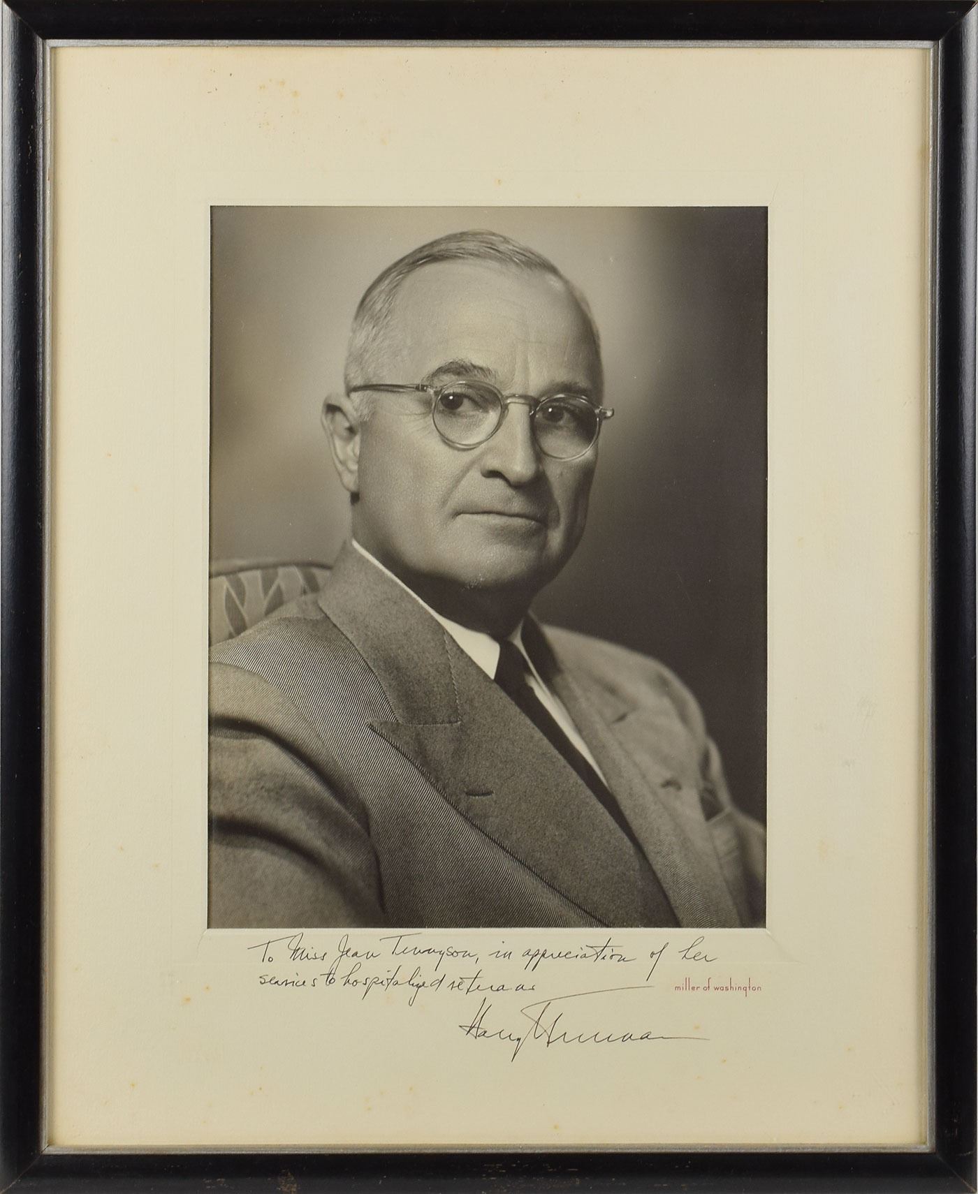 Impressive matte-finish 10 x 13 portrait of Truman in its original 15.5 x 19.5 presentation mat, signed and inscribed on the mat in fountain pen, "To Miss Jean Tennyson, in appreciation of her services to hospitalized veterans, Harry S. Truman." Framed to an overall size of 17.5 x 19.5. In fine condition, with scattered light foxing to the mat. Jean Tennyson was an operatic soprano and noted patron of the arts. Following World War II, she founded the Artists Veterans Hospital Programs of the Musicians Emergency Fund, which presented concerts for patients in veterans hospitals.