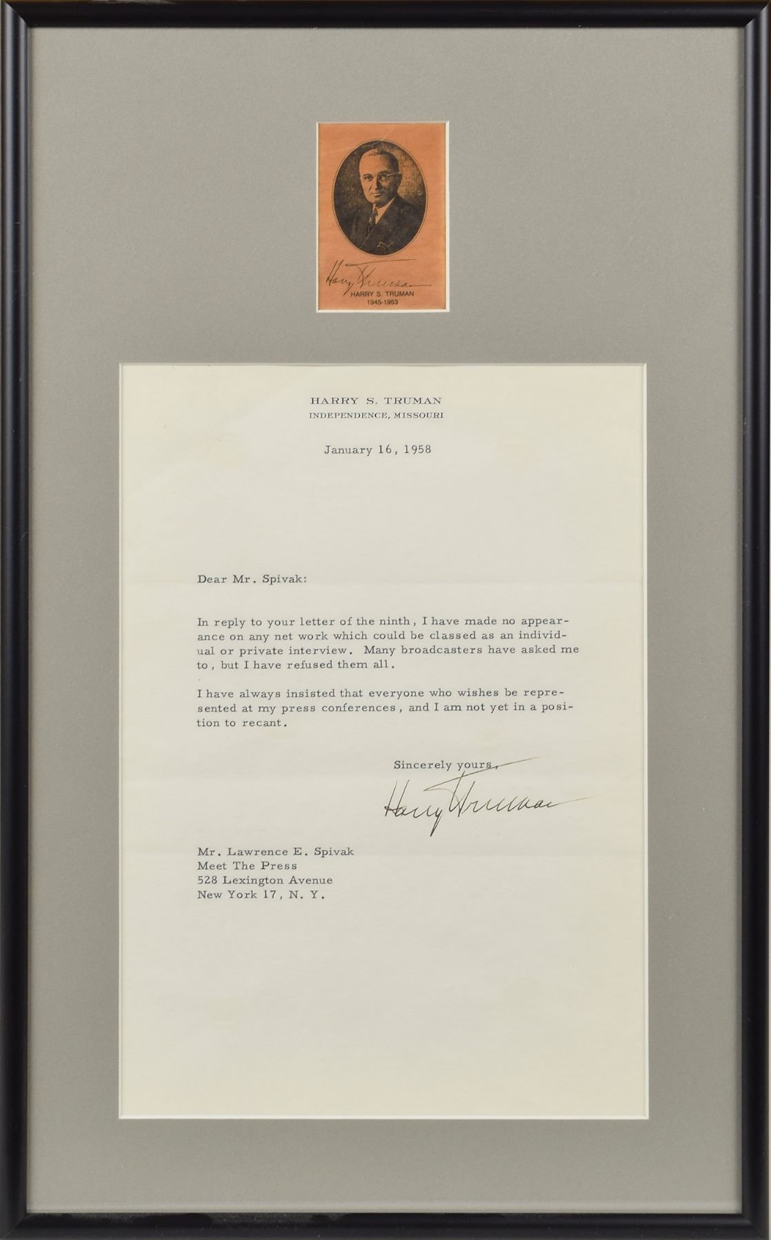 TLS, one page, 7 x 10, personal letterhead, January 16, 1958. Letter to Lawrence Spivak, the moderator of Meet the Press, in full: “In reply to your letter of the ninth, I have made no appearance on any net work which could be classified as an individual or private interview. Many broadcasters have asked me to, but I have refused them all. I have always insisted that everyone who wishes be represented at my press conferences, and I am not yet in a position to recant.” Matted and framed with a small image of Truman to an overall size of 10.25 x 16.5. In fine condition, with a light crease to the upper left corner, and light show-through from mounting remnants on the reverse.