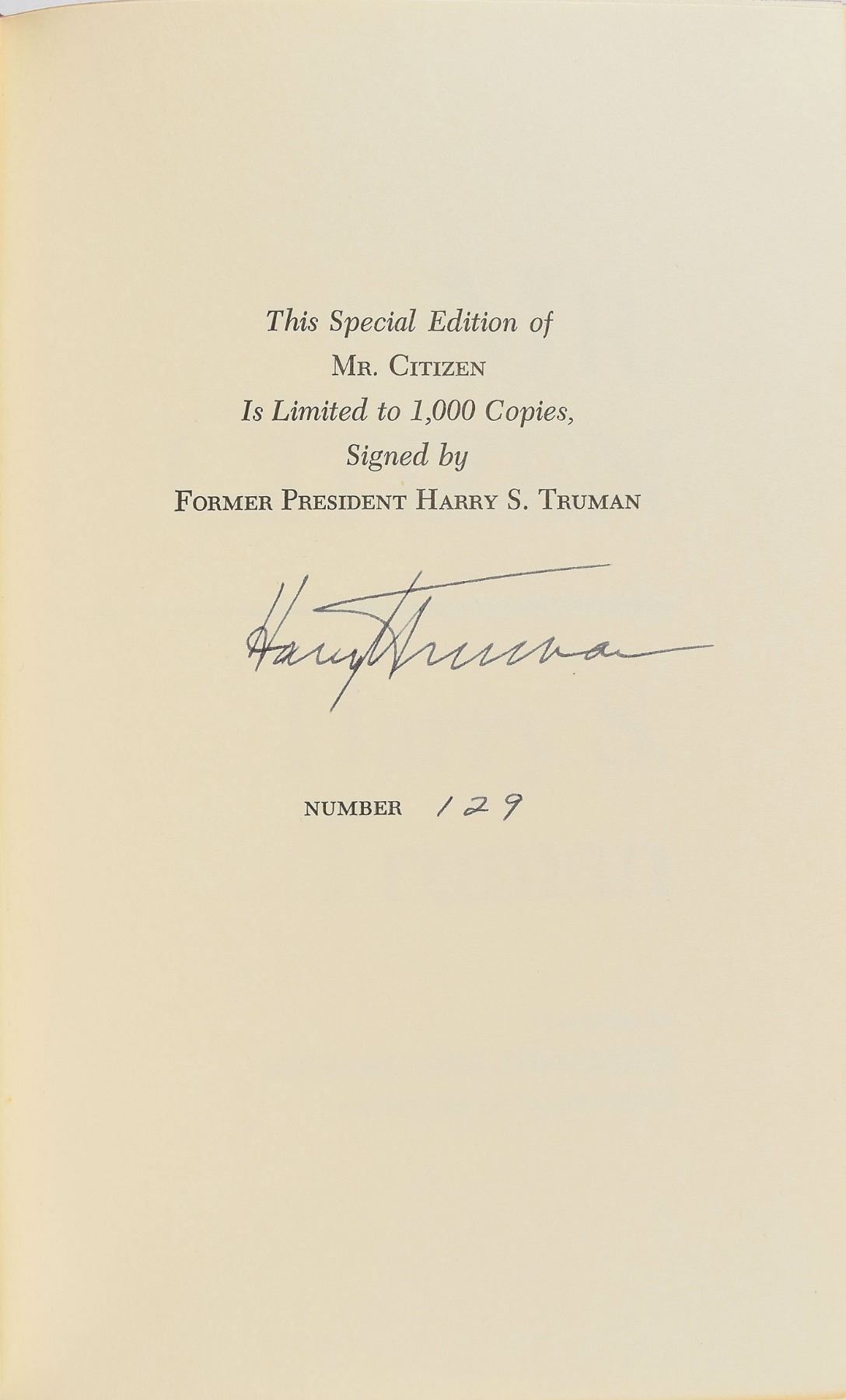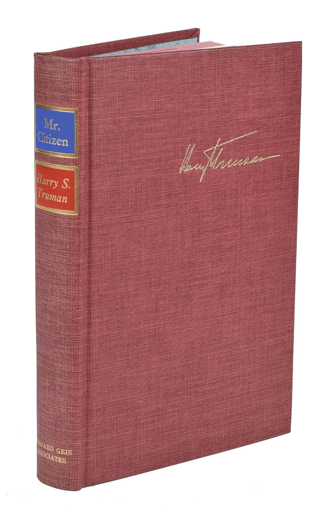 Signed book: Mr. Citizen. Special edition, limited issue, numbered 129/1000. NY: Bernard Geis Associates, 1960. Hardcover with slipcase, 6.25 x 9.25, 315 pages. Signed on the colophon in fountain pen by Truman. In fine condition, with light sunning to the slipcase.