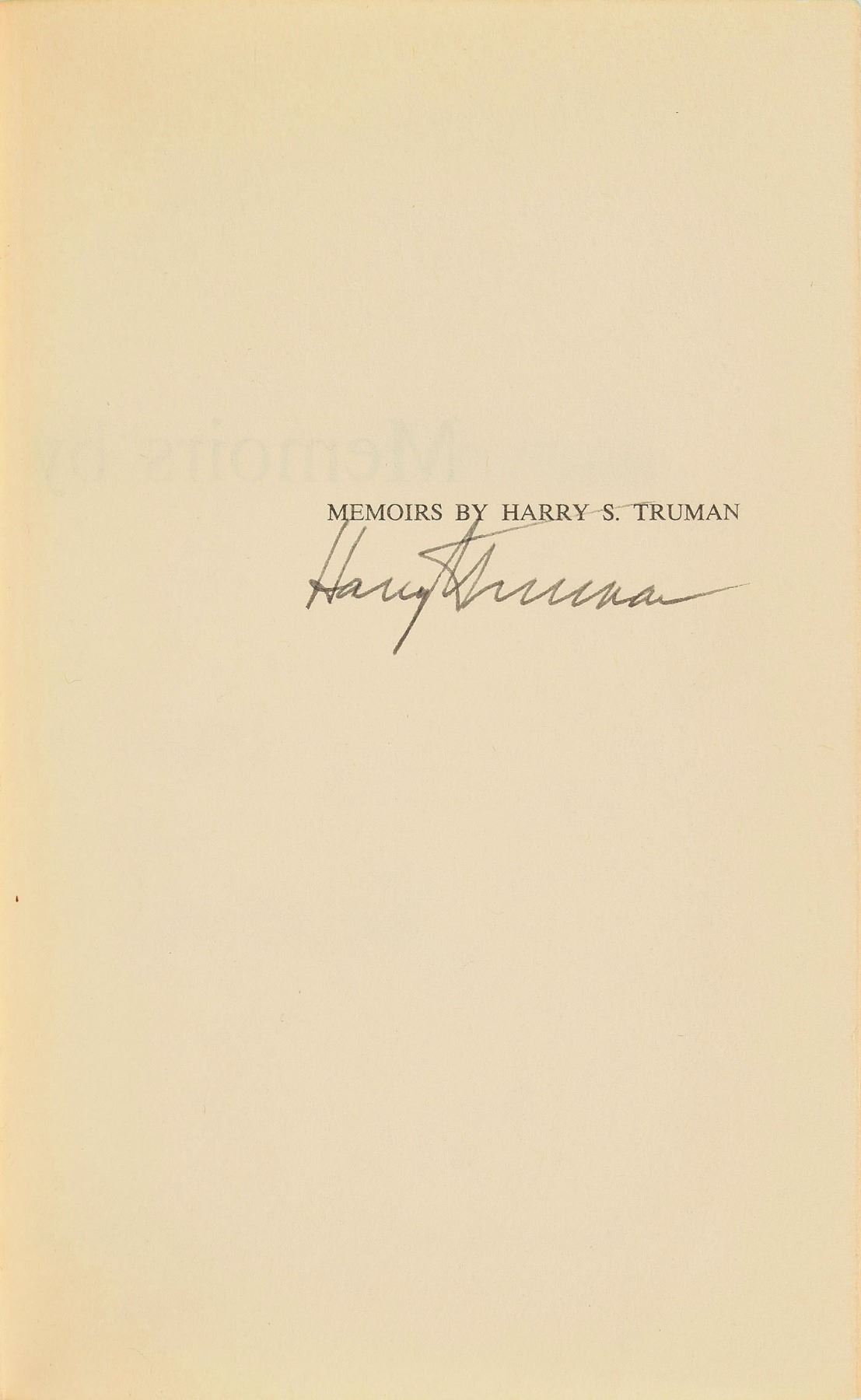 Signed book: Memoirs by Harry S. Truman, Volume One: Year of Decisions. Special Kansas City Edition, limited to 20,615 copies: Doubleday, 1955. Hardcover with dust jacket, 5.75 x 8.5, 596 pages. Signed on the half-title page in fountain pen by Truman. Includes an unsigned Kansas City edition (limited to 11,500) of the second volume, Years of Trial and Hope, hardcover missing its dust jacket. In very good to fine condition, with chipping, toning, and creasing to the dust jacket of the signed volume.
