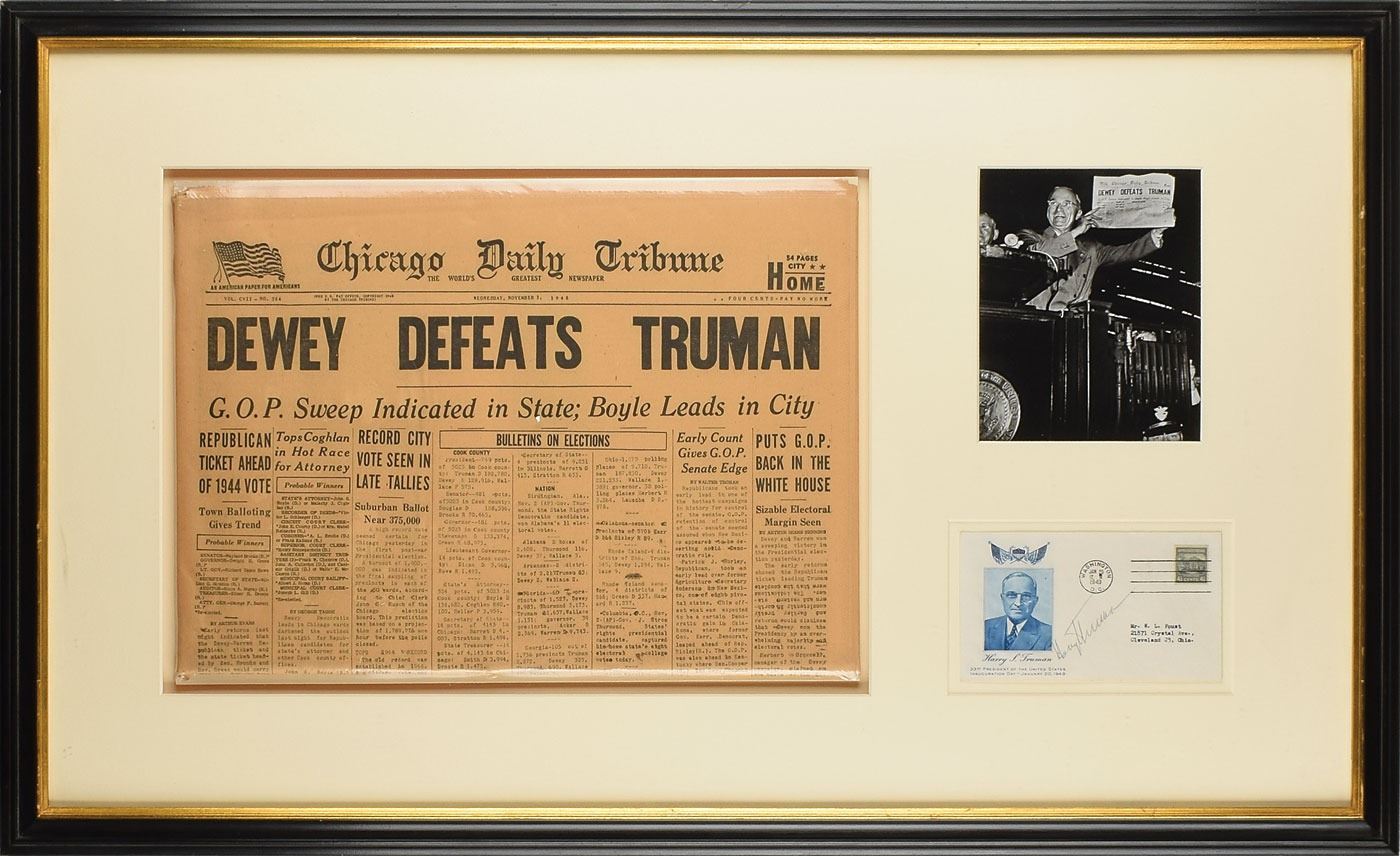 Superb display featuring a rare issue of the Chicago Daily Tribune of November 3, 1948, 17 x 24, featuring the iconic banner headline "Dewey Defeats Truman," paired with a commemorative inauguration day cover, signed in ballpoint by Truman. Matted and framed with an image of Truman holding the infamous newspaper to an overall size of 34.75 x 21.25. In overall fine condition; the newspaper is folded and has not been examined outside of the display.