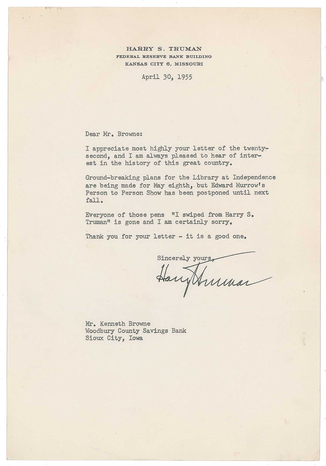 TLS, one page, 7.25 x 10.5, personal letterhead, April 30, 1955. Letter to Kenneth Browne, in part: "Ground-breaking plans for the Library at Independence are being made for May eighth, but Edward Murrow's Person to Person Show has been postponed until next fall. Everyone of those pens 'I swiped from Harry S. Truman' is gone and I am certainly sorry." In fine condition, with light creasing to the lower left corner, and staple holes to the upper left. Accompanied by the original mailing envelope.