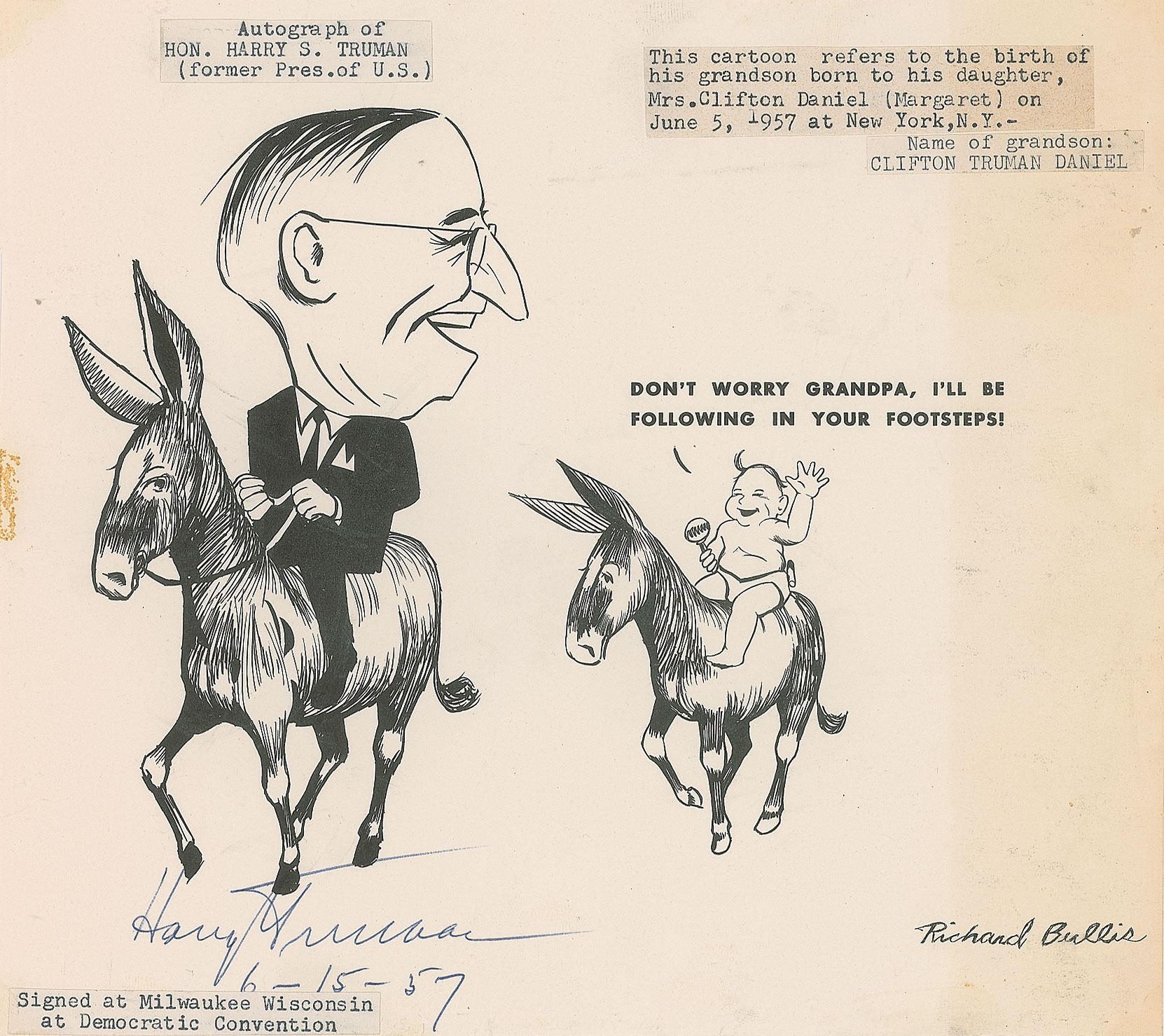 Print of a political cartoon by Richard Bullis, 9.5 x 8.5, showing former President Harry S. Truman atop a donkey with a large toddler riding behind and saying: "Don't worry Grandpa, I'll be following in your footsteps!" Signed in the lower left in black ballpoint, "Harry S. Truman, 6–15–57." The print features four affixed typed captions, with two explaining that the "cartoon refers to the birth of his grandson born to his daughter, Mrs. Clifton Daniel (Margaret) on June 5, 1957" and that the print was signed "at Milwaukee Wisconsin on Democratic Convention." In very good to fine condition, with light toning along the right edge, and a small bit of old tape residue to the left edge.