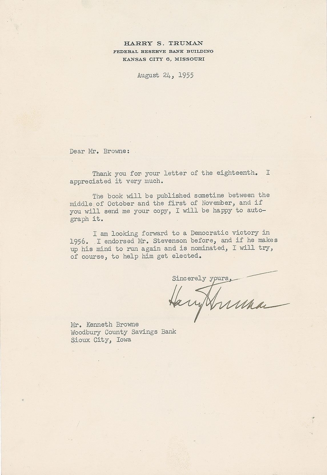 TLS, one page, 7.25 x 10.5, personal letterhead, August 24, 1955. Letter to Kenneth Browne, in part: "The book will be published sometime between the middle of October and the first of November, and if you send me your copy, I will be happy to autograph it. I am looking forward to a Democratic victory in 1956. I endorsed Mr. Stevenson before, and if he makes up his mind to run again and is nominated, I will try, of course, to help him get elected." In fine condition. Accompanied by the original mailing envelope.