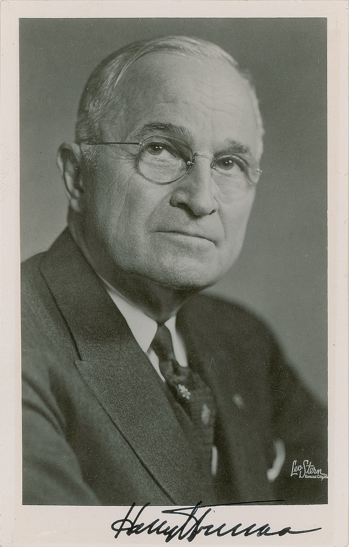 Handsome glossy 3.5 x 5.5 photo of Truman in a suit and tie, boldly signed in the lower border in fountain pen. In fine condition.