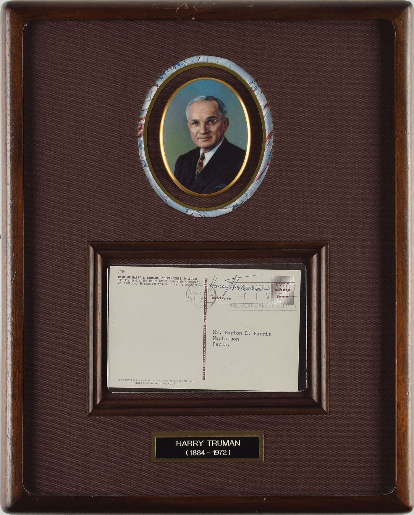 Free-franked postcard depicting Harry S. Truman's home in Independence, Missouri, 5.5 x 3.5, addressed in type to "Mr. Burton L. Harris, Nicholson, Pa.," and franked in the upper right in blue ballpoint, "Harry S. Truman." Postmarked at New York, April 1, 1957. Archivally encapsulated in Mylar, mounted, matted, and framed with a gilt-edged porcelain ‘Oval Office Collection’ portrait by Christian Bell Porcelain and nameplate to an overall size of 11.75 x 14.75. In fine condition, with scratching to the top of the frame.