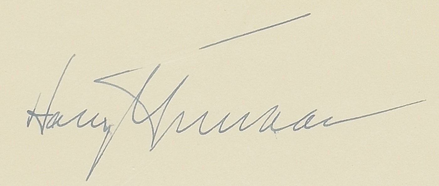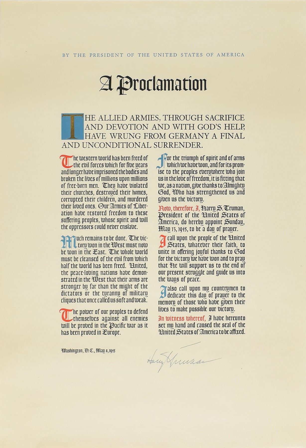Now, therefore, I, Harry S. Truman, President of the United States of America, do hereby appoint Sunday, May 13, 1945, to be a day of prayer. I call upon the people of the United States, whatever their faith, to unite in offering joyful thanks to God for the victory we have won and to pray that he will support us to the end of our present struggle and guide us into the ways of peace. I also call upon my countrymen to dedicate this day of prayer to the memory of those who have given their lives to make possible our victory. In witness whereof, I have hereunto set my hand and caused the seal of the United States of America to be affixed." Prominently signed at the conclusion in black ink by Truman. In fine to very fine condition. On Truman's 61st birthday, May 8, 1945, having only recently assumed the presidency, he held a press conference in the Oval Office to announce Germany's surrender from World War II. Before an audience of his cabinet and other dignitaries, President Truman delivered this proclamation and declared May 13, 1945, a day of prayer in honor of those who served. A wonderful proclamation from a hard-won day of celebration that brought one of the darkest periods of modern history to a close.