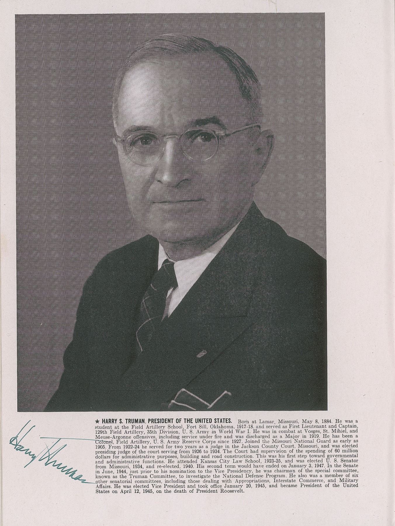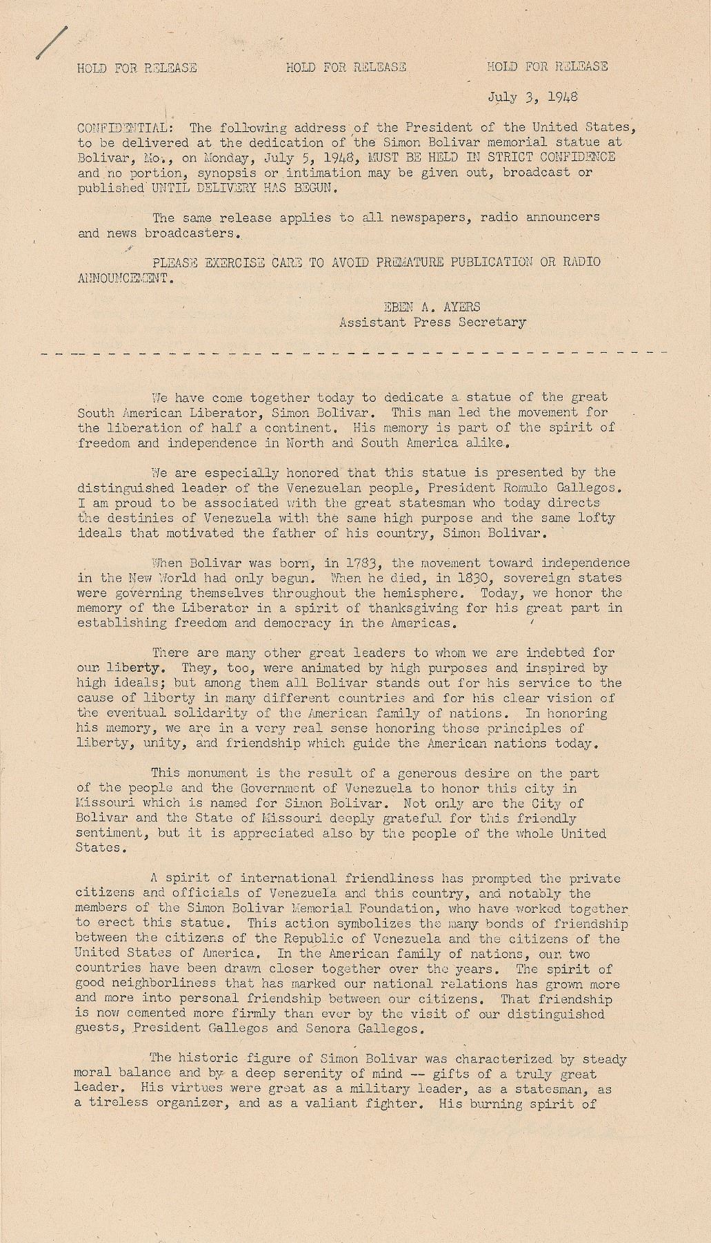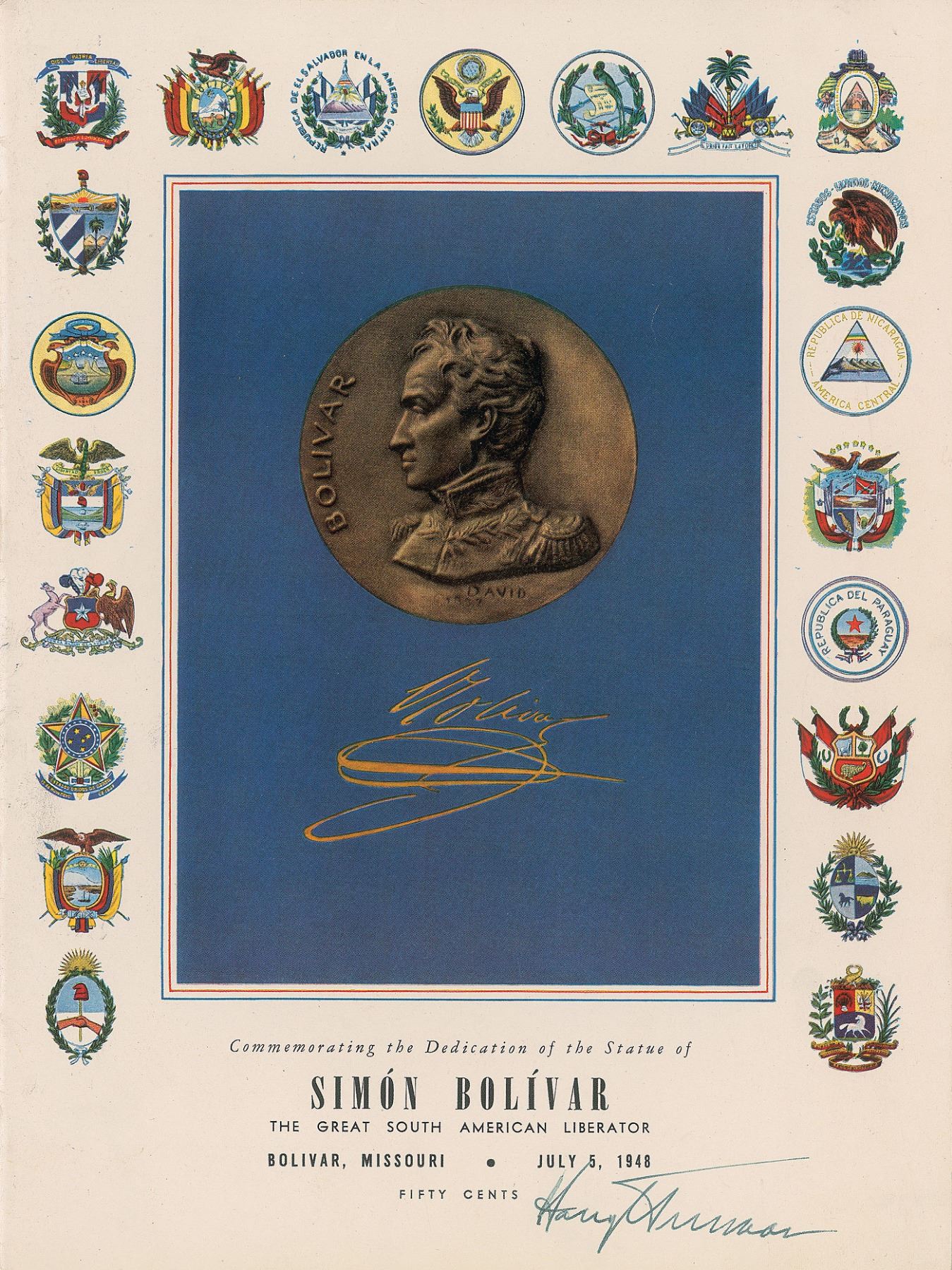 Impressive program and press release from President Harry S. Truman’s statue dedication of Simon Bolivar in Bolivar, Missouri, on July 5, 1948. The original ceremony program, entitled “Commemorating the Dedication of the Statue of Simon Bolivar, the Great South American Liberator,” 76 pages, 9 x 12, is signed on the front cover in fountain pen by Truman, who also signs again on page 14 below his presidential portrait. The stapled press release, two pages, 8 x 14, issued by Assistant Press Secretary Eben A. Ayers, contains the president’s full ceremony speech and is signed at the conclusion in fountain pen by Truman. The speech reads, in part: “We have come together today to dedicate a statue of the great South American Liberator, Simon Bolivar. This man led the movement for the liberation of half a continent. His memory is part of the spirit of freedom and independence in North and South America alike…When Bolivar was born, in 1783, the movement toward independence in the New World had only begun. When he died, in 1830, sovereign states were governing themselves throughout the whole hemisphere. Today, we honor the memory of the Liberator in a spirit of thanksgiving for his great part in establishing freedom and democracy in the Americas…If at times our progress seems slow, we must remain steadfast in the faith which sustained the great leaders of the past who, like Simon Bolivar, fought for human liberty and understanding among the nations. This monument will be an enduring symbol of these great aspirations, of the warm friendship between Venezuela and the United States. In this spirit I am glad to accept this statue on behalf of the Government and the people of the United States.” Includes a transmittal letter from Presidential Secretary Matthew J. Connelly, dated September 1, 1948. In overall fine condition.