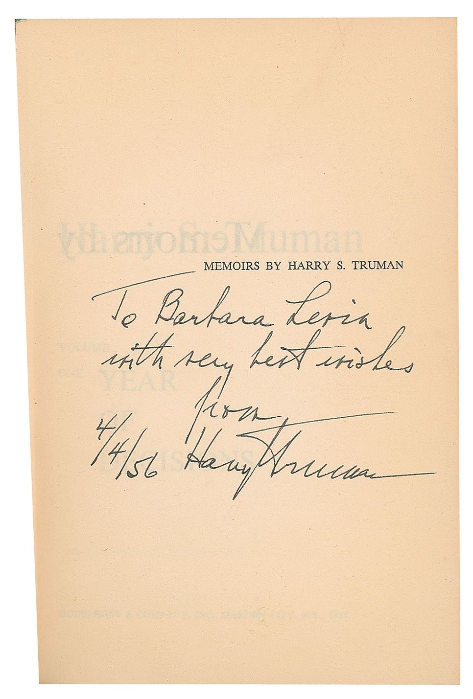 Signed book: Memoirs (Year of Decisions and Years of Trial and Hope) in two volumes. First editions. Garden City: Doubleday & Company, 1955 and 1956. Hardcovers with unclipped dust jackets, 5.75 x 8.5, 594 and 596 pages. Signed and inscribed on the half-title page of the first volume, "To Barbara Levin, with very best wishes, from Harry S. Truman, 4/4/56." In very good to fine condition, with light creasing and soiling to the dust jackets.