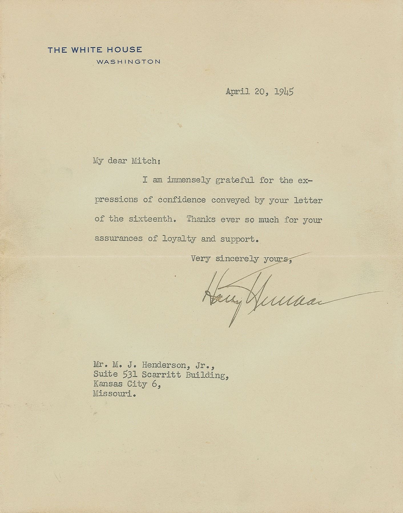 TLS as president, one page, 7 x 8.75, White House letterhead, April 20, 1945. Letter to Mitch J. Henderson, Jr., in full: "I am immensely grateful for the expressions of confidence conveyed by your letter of the sixteenth. Thanks ever so much for your assurances of loyalty and support." In very good to fine condition, with some creases and an extra horizontal fold. Accompanied by the original mailing envelope.