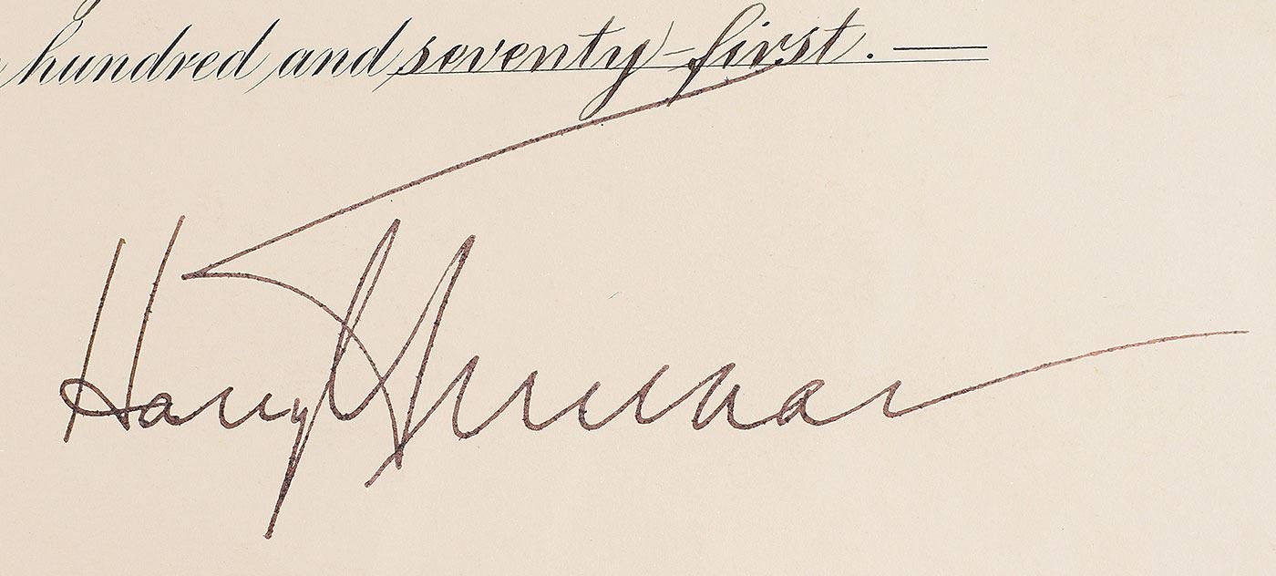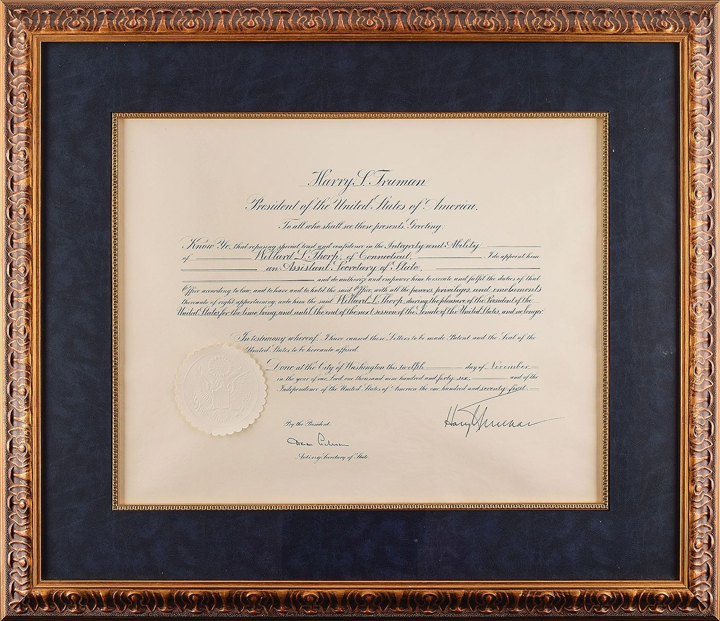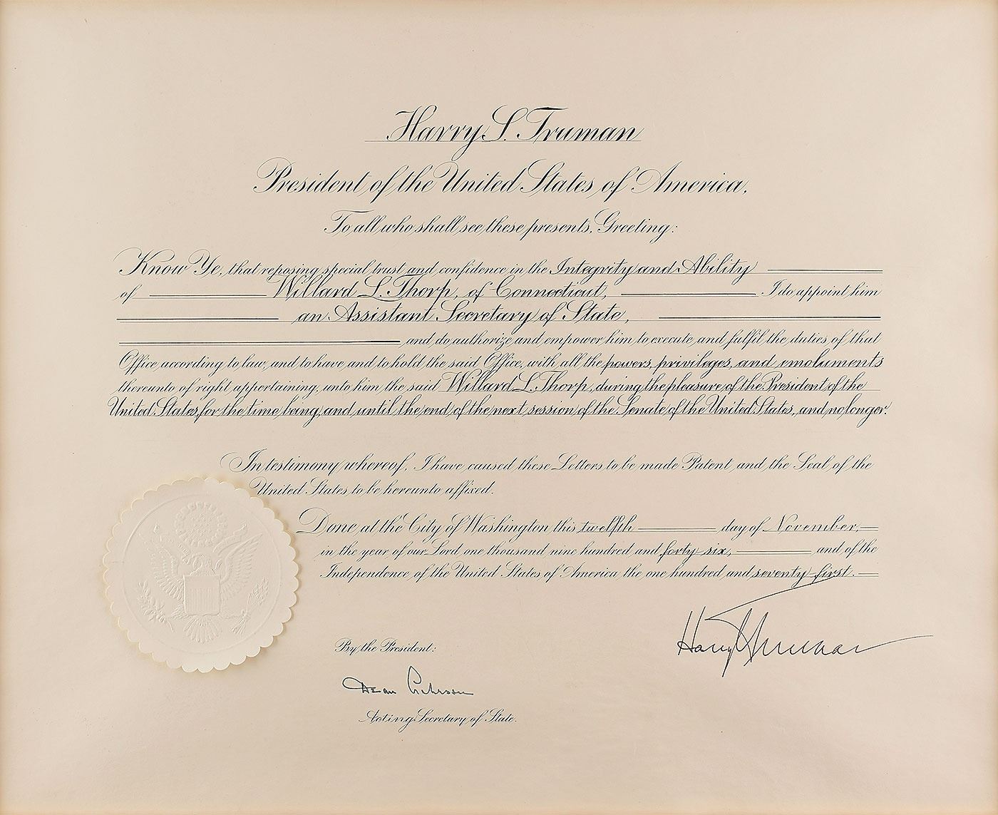 Partly-printed DS as president, one page, 19.25 x 15.25, November 12, 1946. President Truman appoints Willard L. Thorp "an Assistant Secretary of State…for the time being and until the end of the next session of the Senate of the United States, and no longer." Signed at the conclusion by Truman and countersigned by acting Secretary of State Dean Acheson. Nicely matted and framed to an overall size of 29 x 25. In fine condition, with some light curling to the intact seal. Thorp was an economist who worked as an advisor in both domestic and foreign affairs under Truman and his predecessor, Franklin D. Roosevelt. Under Truman, he helped develop the Marshall Plan, served as a special advisor at the Paris Peace Conference, and as a representative to the United Nations General Assembly from 1947 to 1948. Under heavy scrutiny during Senator Joseph McCarthy's investigations into alleged Communists in the federal government, he resigned in 1952, ending his distinguished career in a flurry of scandal.