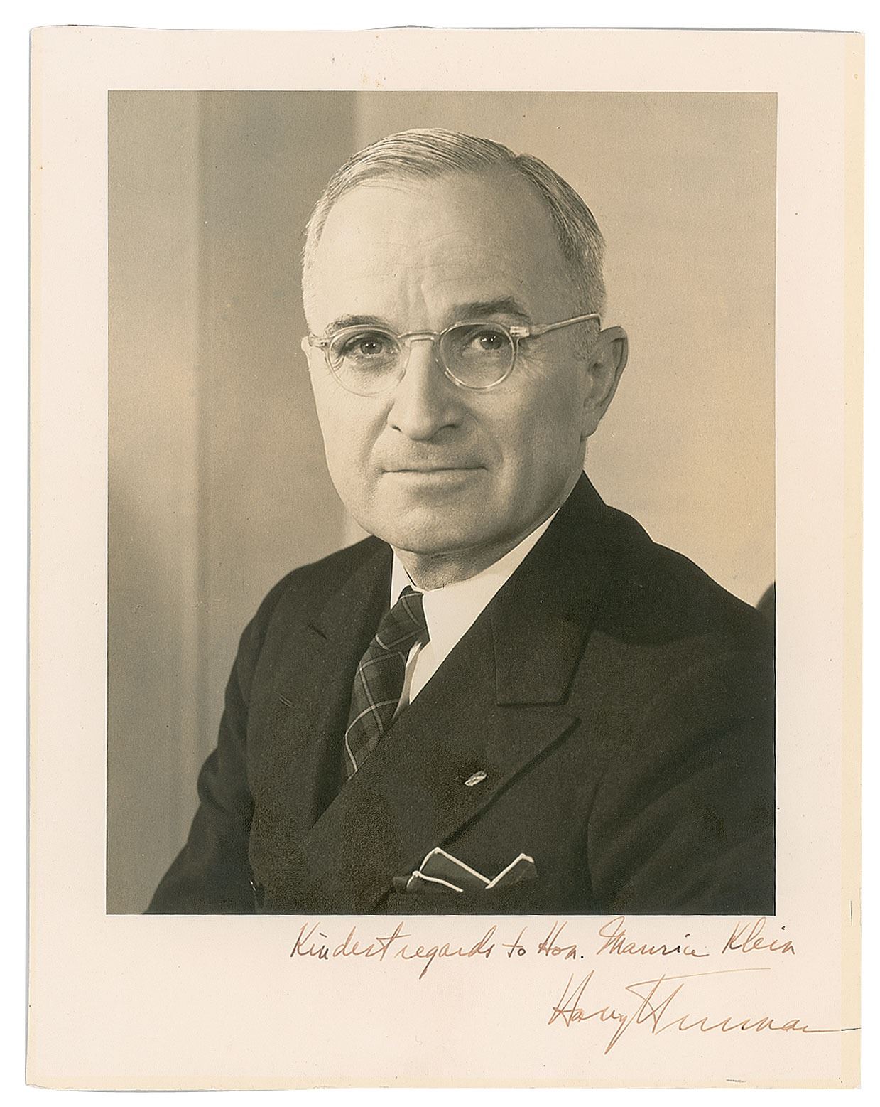 Vintage matte-finish 9.5 x 12.25 photo of the 33rd American President, signed and inscribed in fountain pen, "Kindest regards to Hon. Maurice Klein, Harry S. Truman.” Affixed to a same-size mount. In fine condition, with trimmed edges.