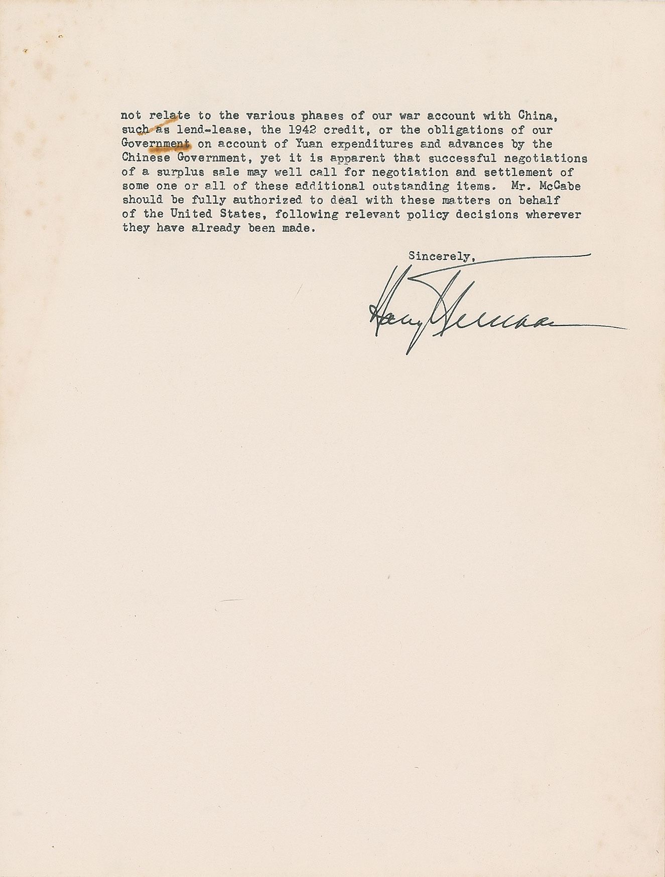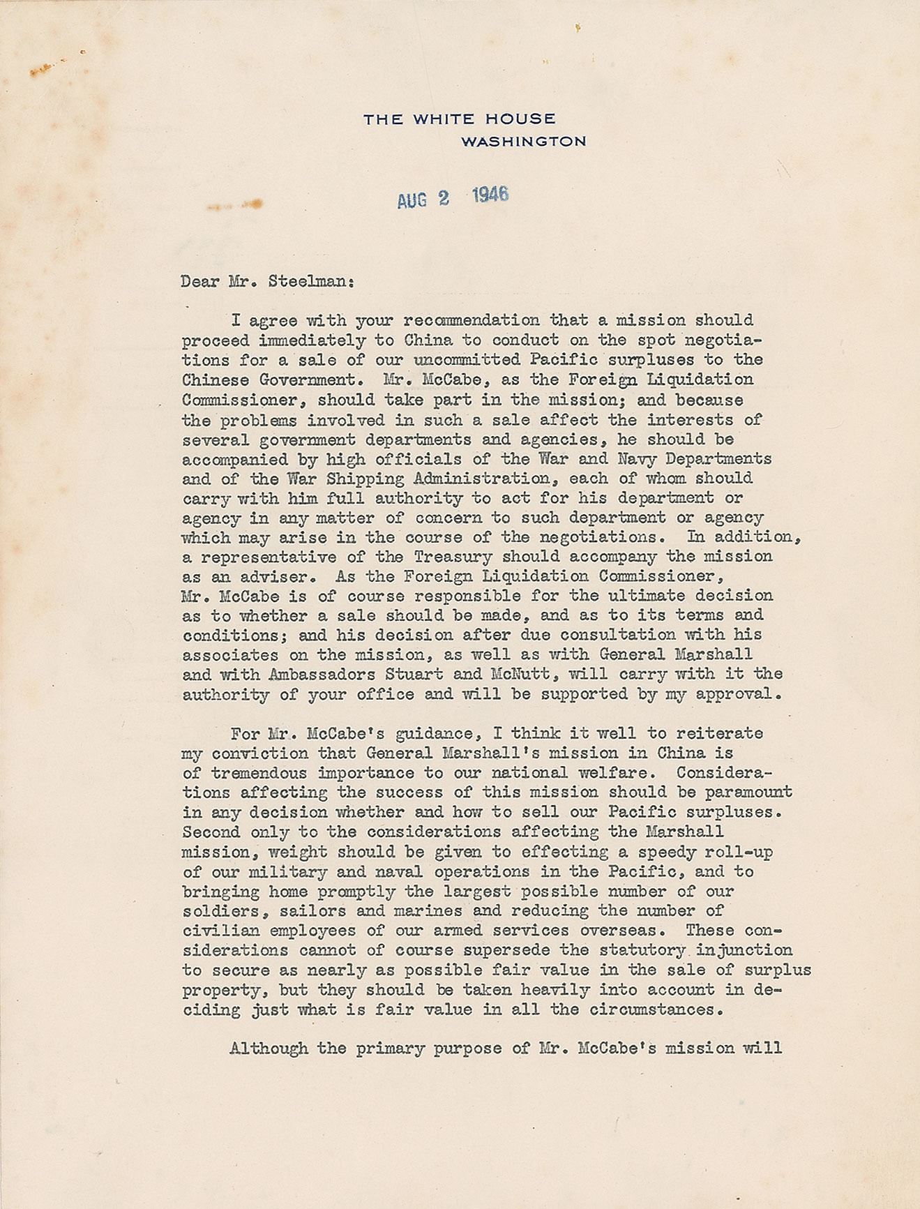 TLS as president, two pages, 8 x 10.5, White House letterhead, August 2, 1946. Letter to Dr. John Roy Steelman, his White House Chief of Staff, in full: "I agree with your recommendation that a mission should proceed immediately to China to conduct on the spot negotiations for a sale of our uncommitted Pacific surpluses to the Chinese Government. Mr. McCabe, as the Foreign Liquidation Commissioner, should take part in the mission; and because the problems involved in such a sale affect the interests of several government departments and agencies, he should be accompanied by high officials of the War and Navy Departments and of the War Shipping Administration, each of whom should carry with him full authority to act for his department or agency in any matter of concern to such department or agency which may arise in the course of the negotiations. In addition, a representative of the Treasury should accompany the mission as an adviser. As the Foreign Liquidation Commissioner, Mr. McCabe is of course responsible for the ultimate decision as to whether a sale should be made, and as to its terms and conditions; and his decision after due consultation with his associates on the mission, as well as with General Marshall and with Ambassadors Stuart and McNutt, will carry with it the authority of your office and will be supported by my approval.