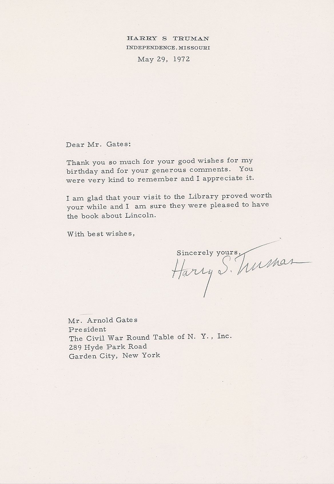 TLS, one page, 7.25 x 10.5, personal letterhead, May 29, 1972. Letter to Arnold Gates, the president of the Civil War Round Table of New York, in full: "Thank you so much for your good wishes for my birthday and for your generous comments. You were very kind to remember and I appreciate it. I am glad that your visit to the Library proved worth your while and I am sure they were pleased to have the book about Lincoln." In fine condition.