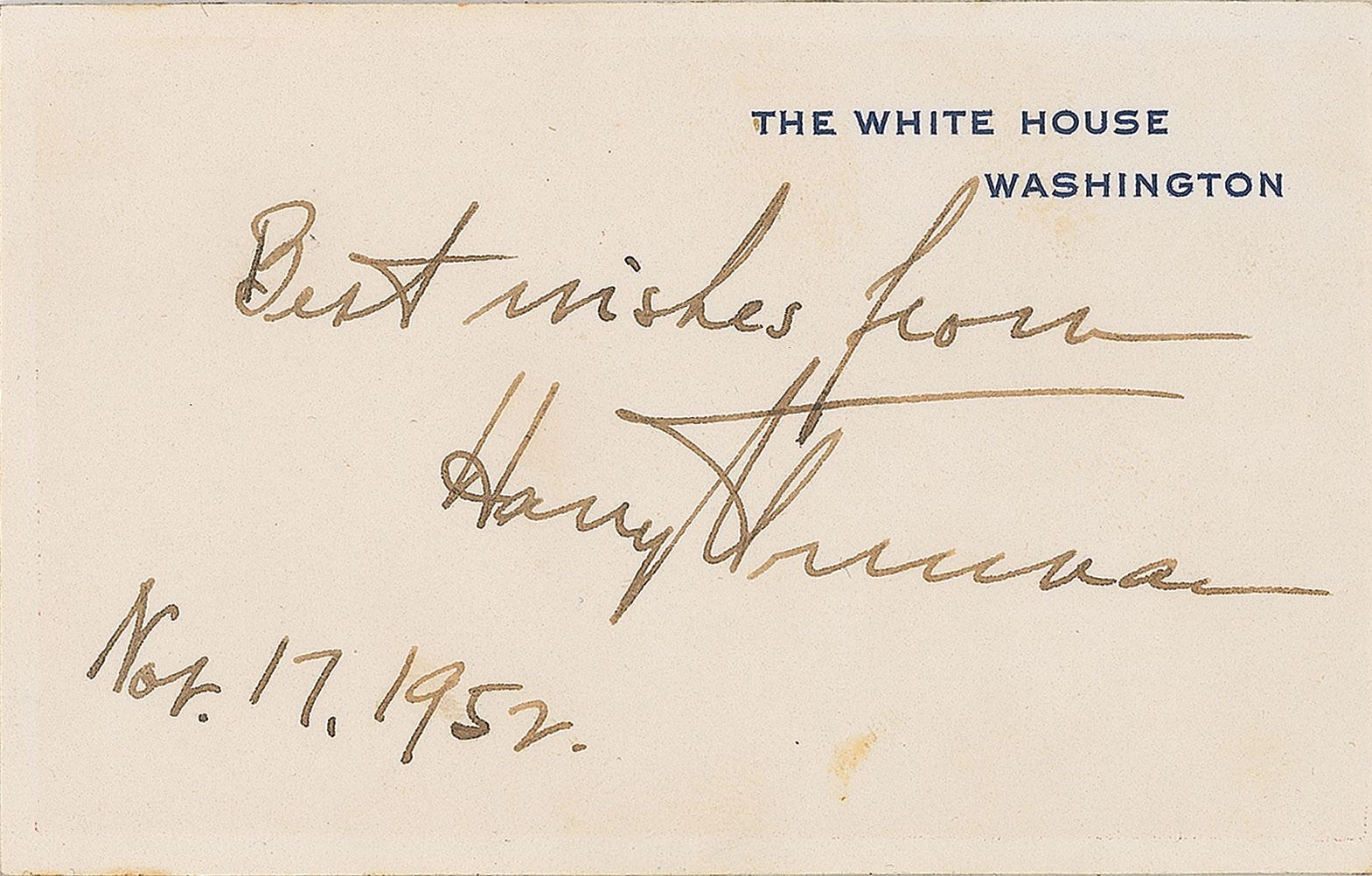Official White House card, signed in fountain pen as president, "Best wishes from Harry S. Truman, Nov. 17, 1952." In very good to fine condition, with very faint toning, and heavy adhesive residue on the reverse.