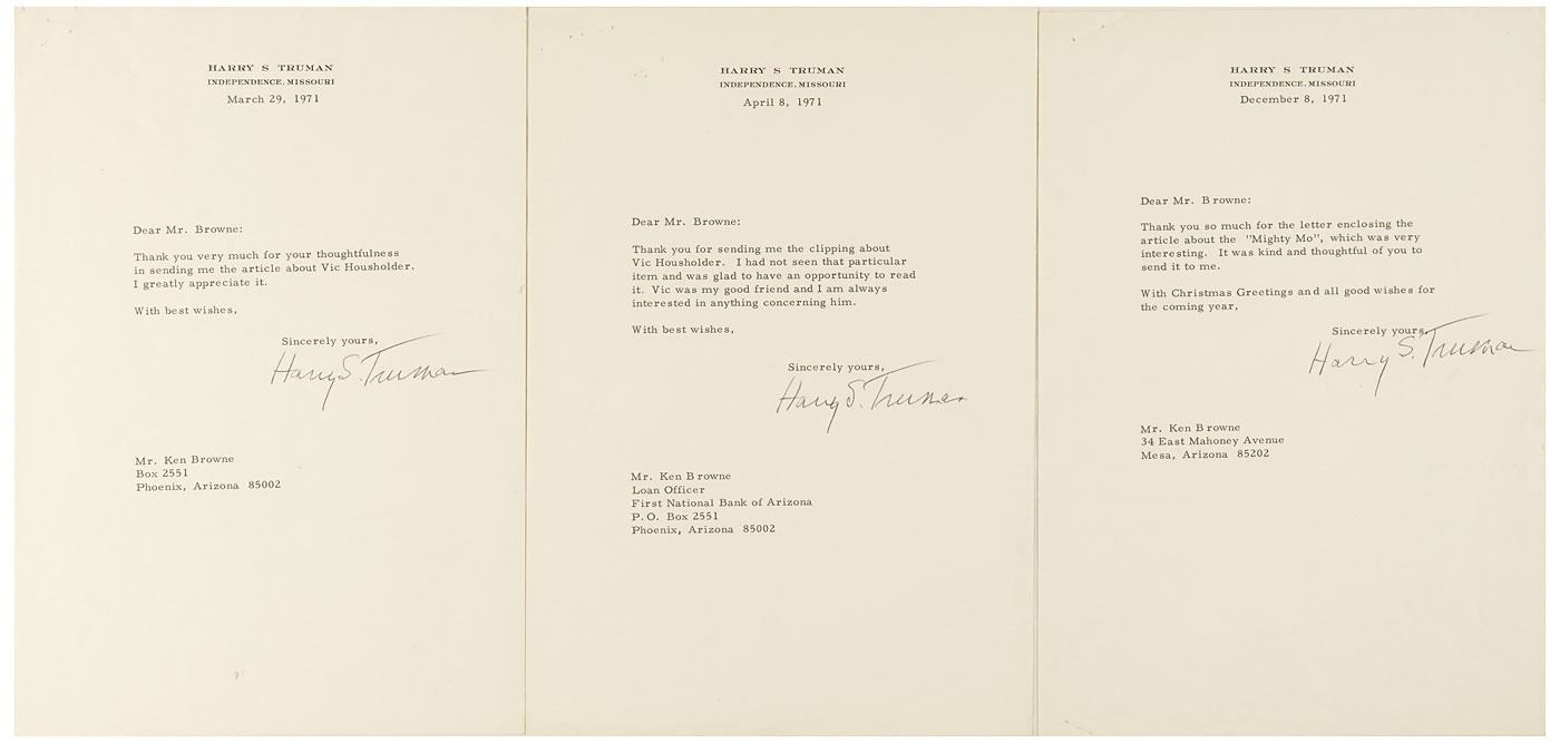 Three TLSs, each one page, 7.25 x 10.5, personal letterhead, dated March–December 1971. Truman sends thanks for "the article about Vic Householder," further appreciation for "the clipping about Vic Householder…Vic was my good friend," and send thanks for an "article about the 'Mighty Mo,' which was very interesting." In fine condition, with staple holes to the upper left corners. Accompanied by the original mailing envelopes, each with a pre-printed free frank.