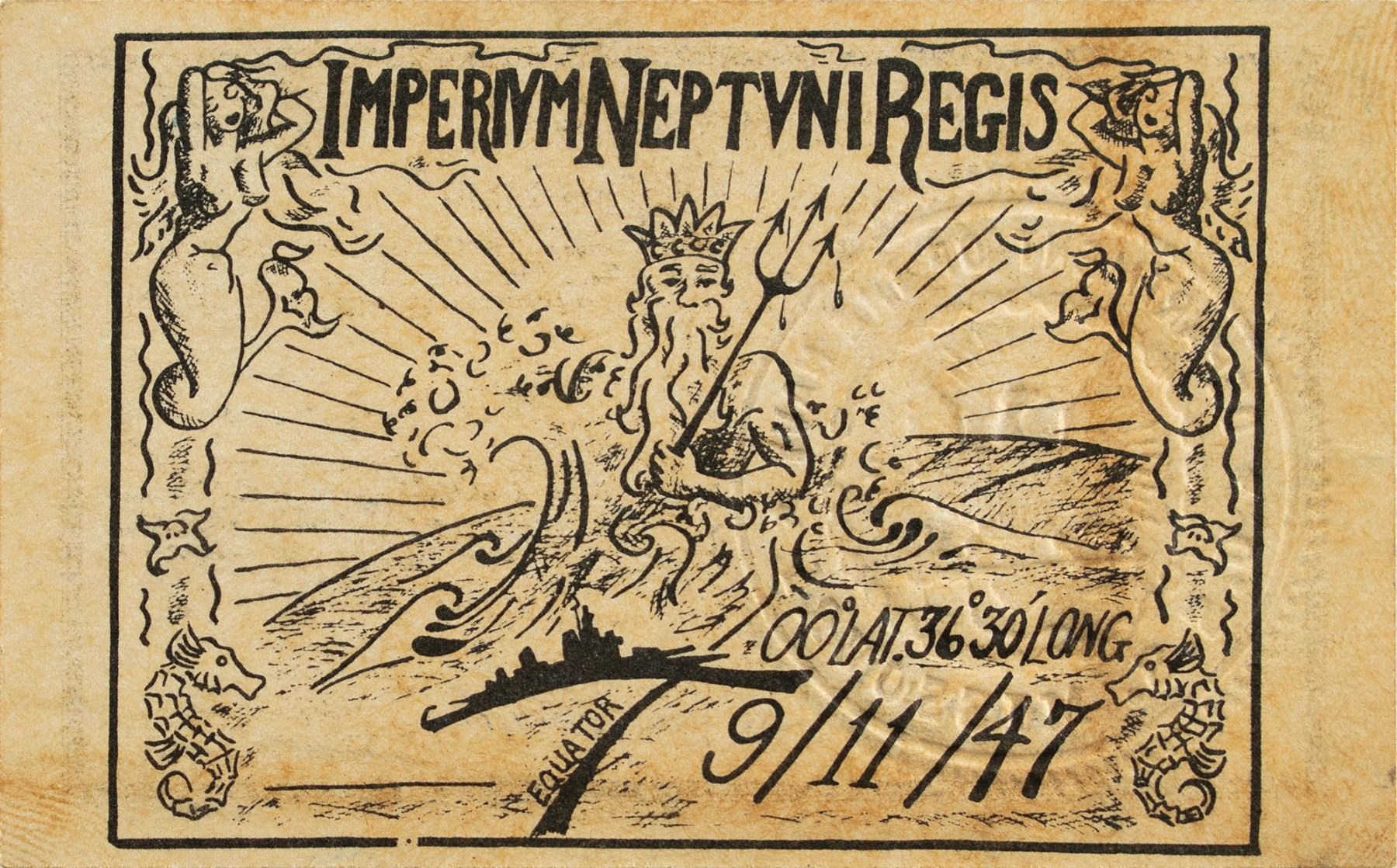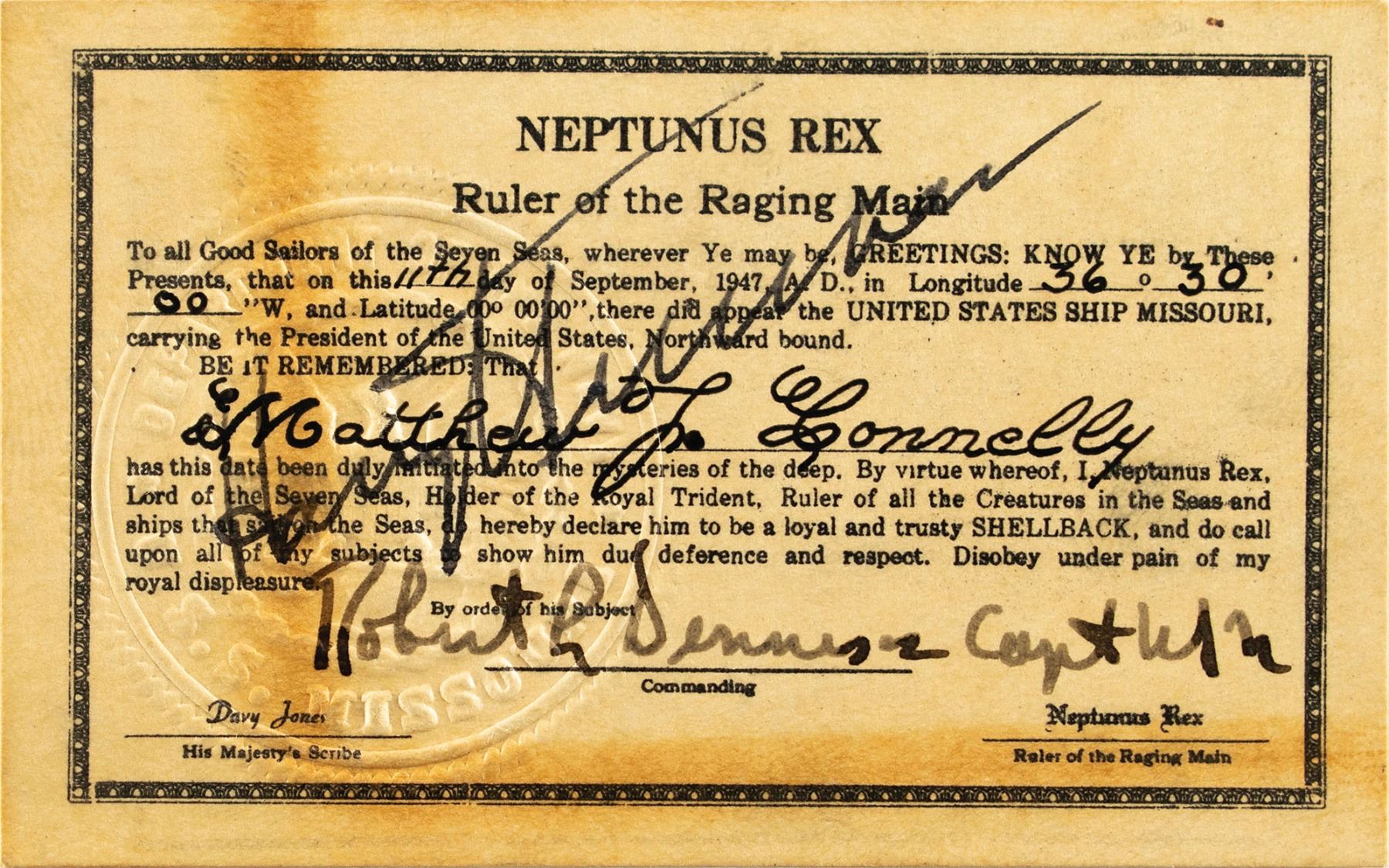 Three items from the "Presidential Cruise" of the USS Missouri in September 1947, including: a "Neptunis Rex" card issued to his secretary Matthew J. Connelly, signed in fountain pen by Harry S. Truman and Captain Robert L. Dennison; a two-page program for the cruise with attached keychain medallion; and Connelly's personal luggage tag for the presidential trip. In overall fine condition.