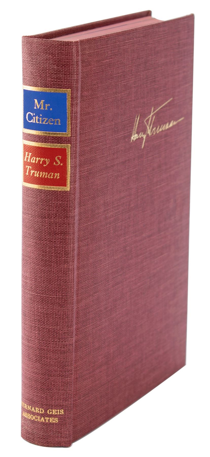 Signed book: Mr. Citizen. Limited special edition, numbered 497/1000. NY: Bernard Geis Associates, 1960. Hardcover with slipcase, 6.25 x 9.25, 315 pages. Signed on the colophon in fountain pen by Harry S. Truman. Autographic condition: very fine. Book condition: VG+/None in a VG slipcase, with edgewear, rubbing, and toning to slipcase.