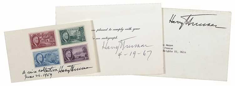 Two items: Ink signature, “A nice collection, Harry S. Truman, June 26, 1959,” at the bottom of an off-white 5 x 3 card, with four Franklin D. Roosevelt postage stamps affixed above signature; and a pre-printed ANS, signed “Harry S. Truman 4-19-67,” complying with a request for an autograph, and accompanied by the original mailing envelope which bears a pre-printed franking signature. In fine condition. Pre-certified John Reznikoff/PSA/DNA and RRAuction COA.