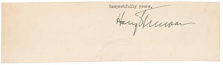 Ink signature, “Harry S. Truman,” on an off-white 8 x 2.25 slip, clipped from the closing of a letter. In fine condition, with a bit of scattered light soiling. Pre-certified John Reznikoff/PSA/DNA and RRAuction COA.