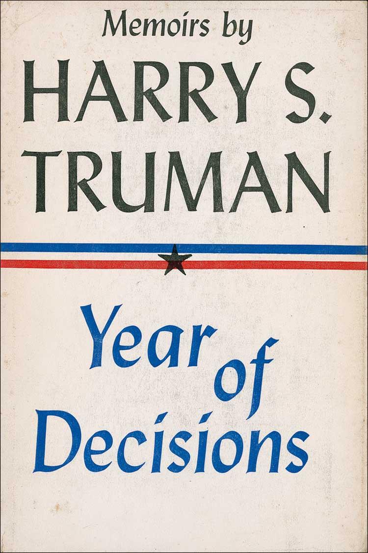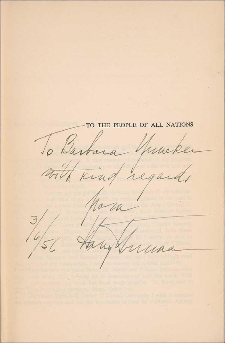 Signed book: Memoirs (Year of Decisions and Years of Trial and Hope) in two volumes. Book of the Month Club first edition. Garden City: Doubleday & Company, 1955. Hardcover with dustjacket, 6 x 8.5, 594 plus 596 pages. Signed and inscribed on the dedication page of Volume I, “To Barbara Yucker with kind regards from Harry S. Truman 3/6/56.” In very good condition, with toning to pages, including signed page, slightly detached front hinge of signed volume, and light toning, foxing, edge tears, and wear to dustjackets. Pre-certified John Reznikoff/PSA/DNA and RRAuction COA.