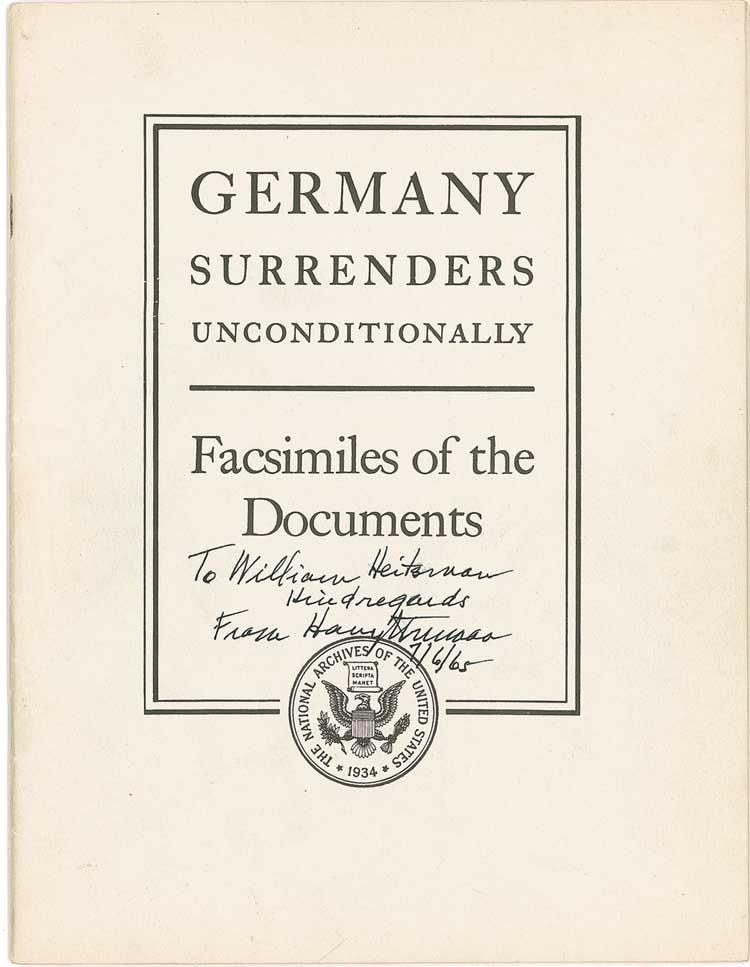 Booklet entitled “Germany Surrenders Unconditionally—Facsimiles of the Documents,” 8 x 10.25, 41 pages, issued by the National Archives in 1945. Signed and inscribed on the front cover in black ink, “To William Heitman, Kind regards from Harry S. Truman, 7/6/65.” In fine condition. Pre-certified John Reznikoff/PSA/DNA and RRAuction COA.