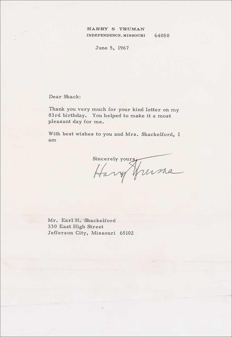 TLS, one page, 7.25 x 10.5, personal letterhead, June 5, 1967. Truman sends thanks for birthday wishes. In part: “Thank you very much for your kind letter on my 83rd birthday. You helped make it a most pleasant day for me.” In fine condition, with staple hole to top left, and horizontal creasing to lower blank portion of page. Pre-certified John Reznikoff/PSA/DNA and RRAuction COA.