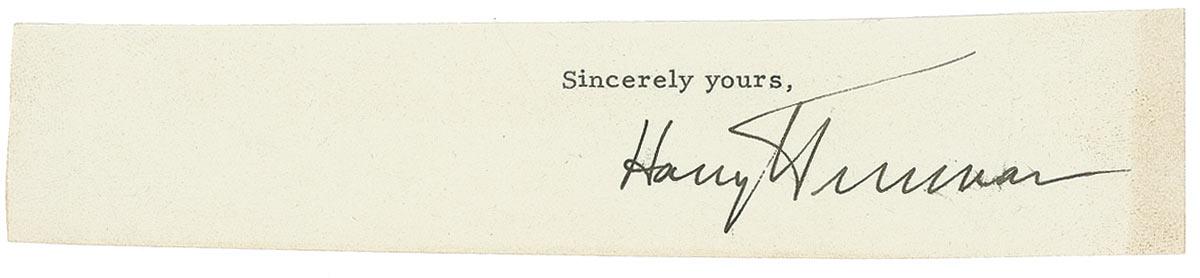 Ink signature “Harry S. Truman” on a light green 7 x 1.5 slip clipped from a larger letter. In fine condition, with thin strip of toning along right edge, and a trivial brush to end of signature. Pre-certified John Reznikoff/PSA/DNA and RRAuction COA.
