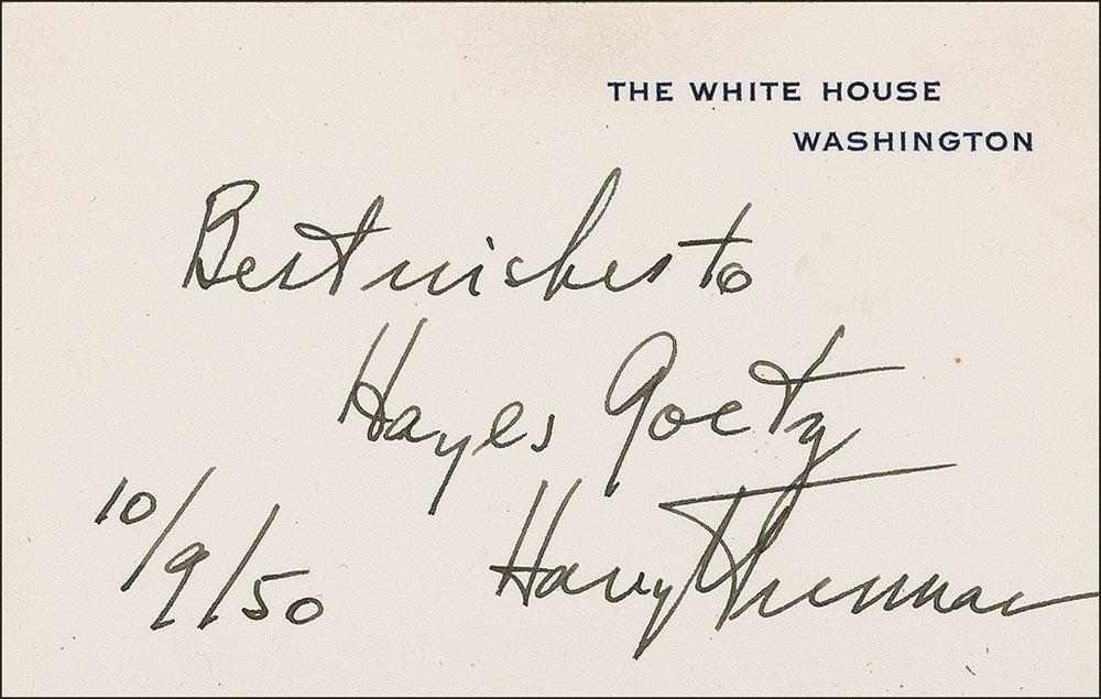 White House card, signed and inscribed in black ink, “Best wishes to Hayes Goetz, Harry S. Truman 10/9/50.” In fine condition. Accompanied by the original transmittal envelope. Pre-certified John Reznikoff/PSA/DNA and RRAuction COA.