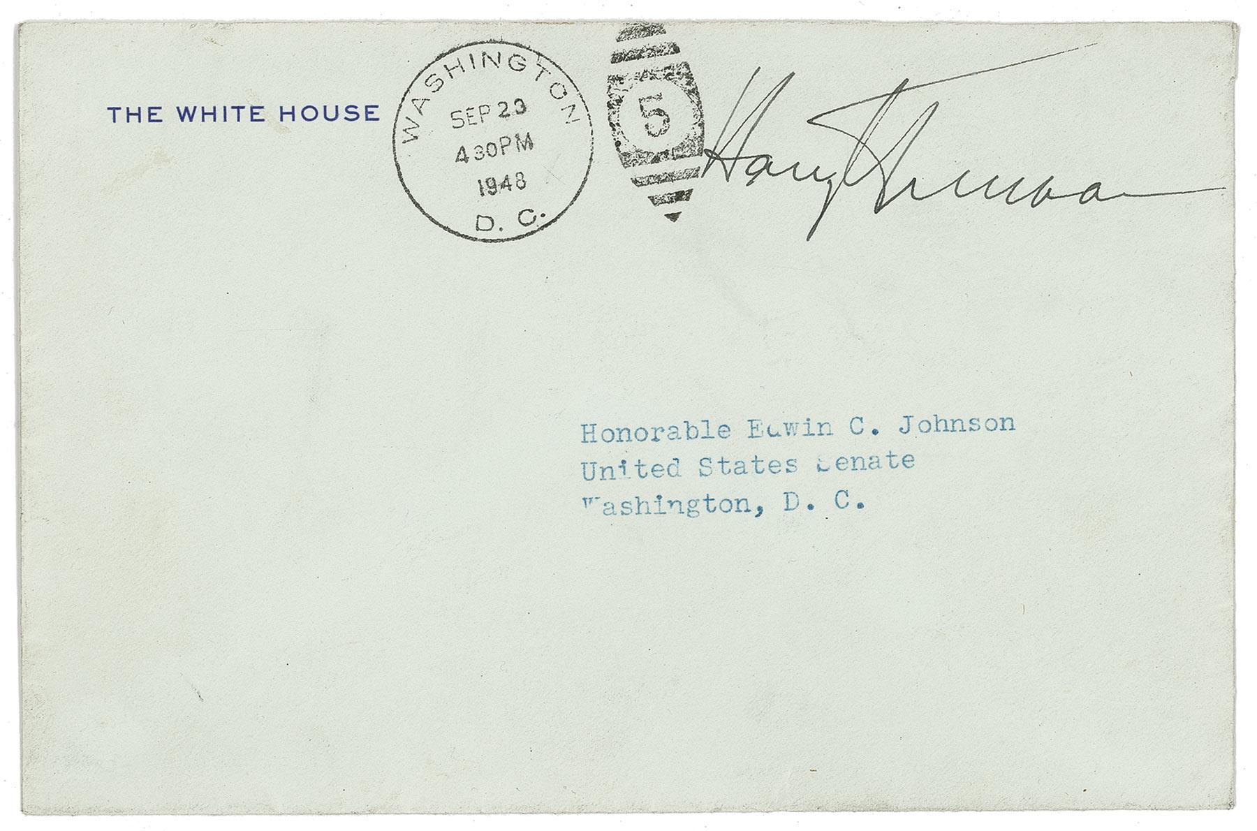 Incredibly rare free franked White House envelope, 7.25 x 4.75, addressed in type to “Honorable Edwin C. Johnson, United States Senate, Washington, D. C.,” and franked in the upper right corner, as president, “Harry S. Truman.” Envelope is postmarked September 23, 1948.” In fine condition, with a few minor edge creases. Truman rarely franked letters, this being the only one as president we have ever seen offered. As a matter of fact, Truman refused to frank envelopes for collectors, saying to do so would be illegal. Pre-certified John Reznikoff/PSA/DNA and RRAuction COA.