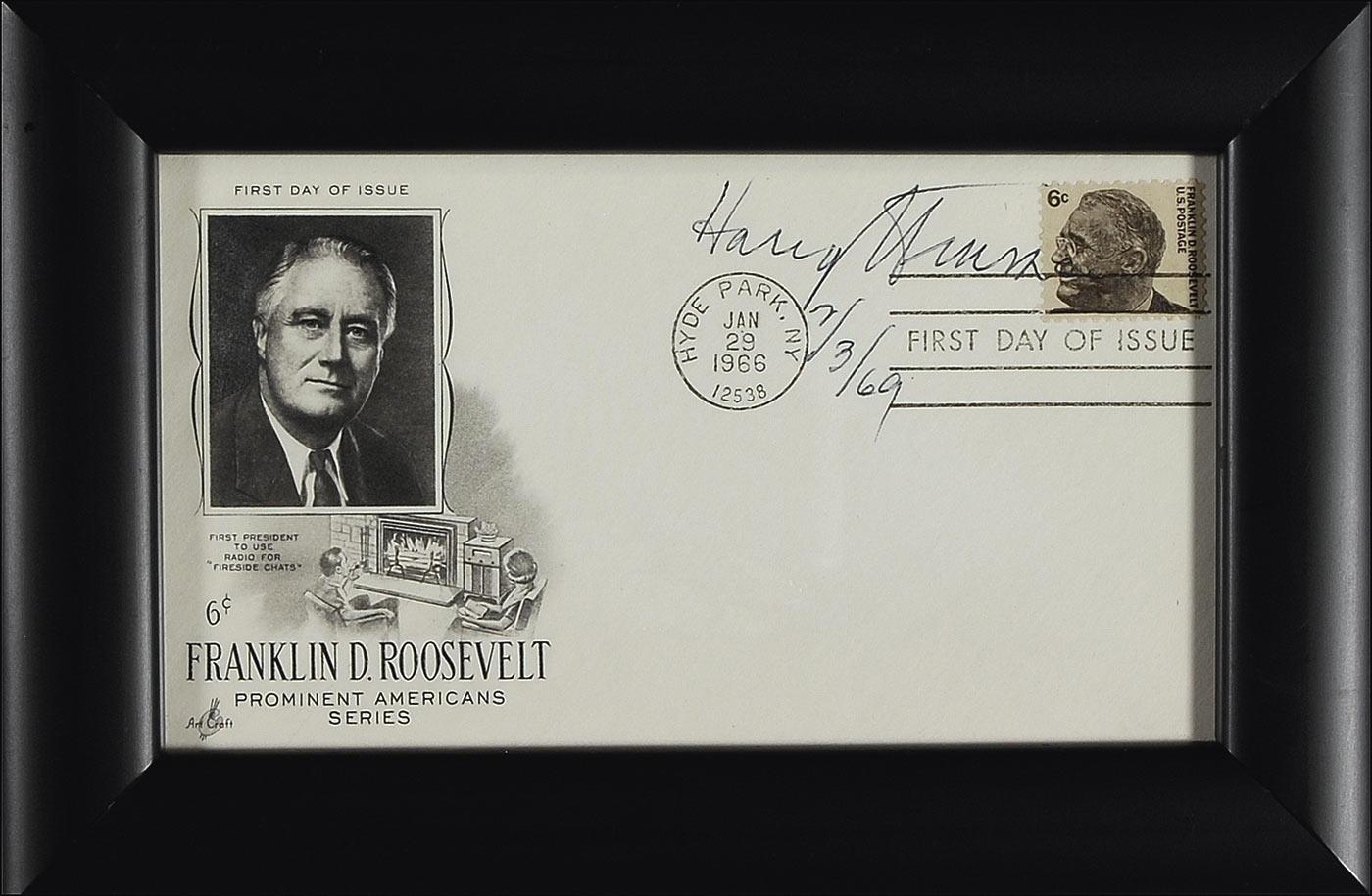 FDC with a cachet honoring Franklin D. Roosevelt, signed at the top in black ink, “Harry S. Truman 7/3/69.” Framed to an overall size of 8.25 x 5.5. In very fine condition. Pre-certified John Reznikoff/PSA/DNA and RRAuction COA.