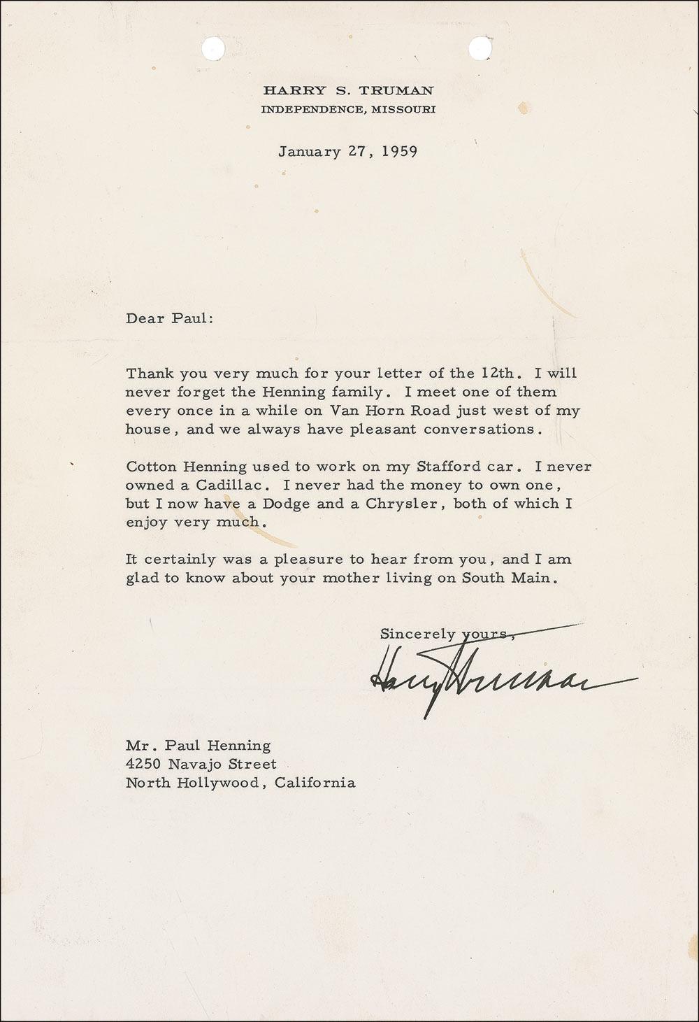 TLS, one page, 7 x 10.5, personal letterhead, January 27, 1959. Truman writes television pioneer Paul Henning, creator of The Beverly Hillbillies and Petticoat Junction. In part, “I will never forget the Henning family. I meet one of them every once in a while on Van Horn Road just west of my house, and we always have pleasant conversations. Cotton Henning used to work on my Stafford car. I never owned a Cadillac. I never had the money to own one, but I now have a Dodge and Chrysler, both of which I enjoy very much.” A few trivial stains, a fold passing through the “y” in “Harry,” staple hole at upper left corner, and two file holes at the top border, otherwise fine condition. Pre-certified John Reznikoff/PSA/DNA and RRAuction COA.