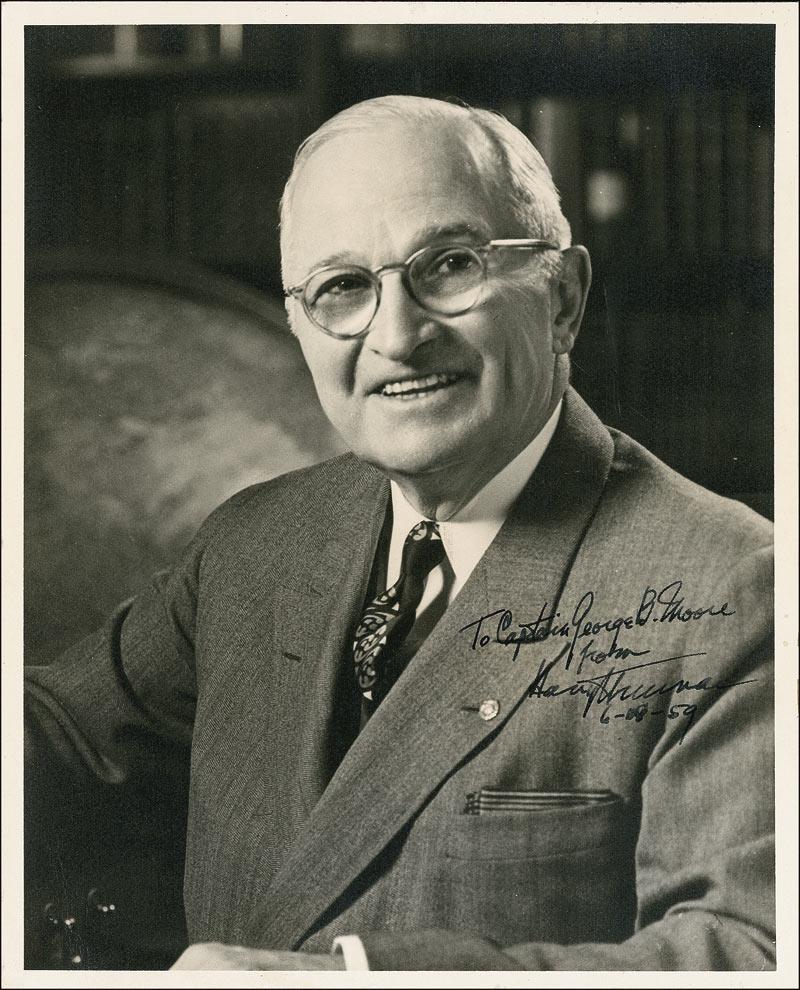 Vintage matte-finish 8 x 10 photo of Truman posing in his study, signed and inscribed in fountain pen “To Captain George B. Moore from Harry Truman 6-8-59.” Photo is affixed to an identical size board. In fine condition, with some light silvering to edges, small line of staining through center of image, and a few light creases. Pre-certified John Reznikoff/PSA/DNA and RRAuction COA.