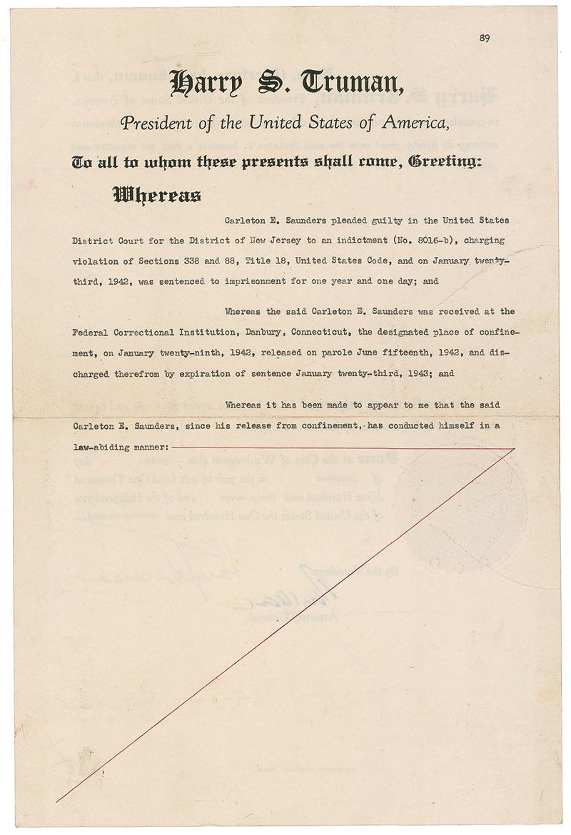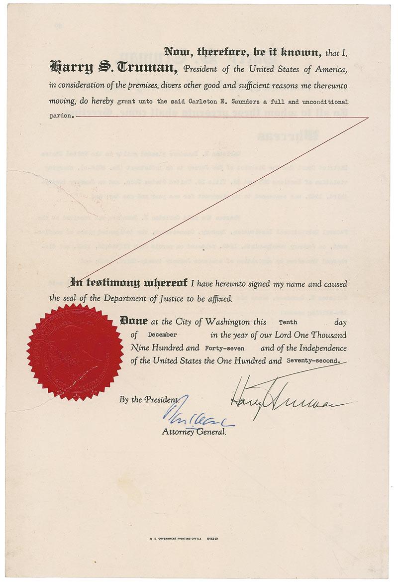 DS as president, one page both sides, 9 x 13.5, December 10, 1947. Presidential pardon given to Carleton E. Saunders who “pleaded guilty in the United States District Court…charging violation of Sections 338 and 88, Title 18…was sentenced to imprisonment for one year and one day…since his release from confinement, has conducted himself in a law-abiding manner. Now, therefore, be it known, that I, Harry S. Truman, President of the United States of America, in consideration of the premises, divers other good and sufficient reasons me thereunto moving, do hereby grant unto the said Carleton E. Saunders a full and unconditional pardon.” In very good condition, with intersecting folds, one through a single letter of signature, two tears to left edge, one through lower portion of seal, and some scattered light soiling. Section 338 Title 18 of the US Code concerns using the US mail to defraud. Actual pardons signed by presidents rarely appear on the market. Pre-certified John Reznikoff/PSA/DNA and RRAuction COA.