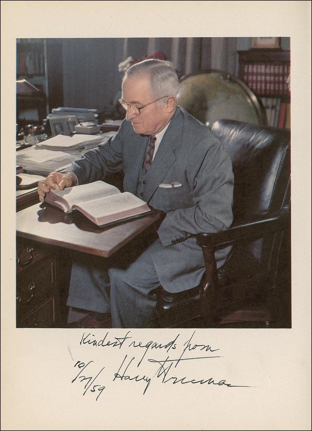 Signed book: Mr. President. First edition, first printing. NY: Farrar, Straus, and Young, 1952. Hardcover with dustjacket, 8.25 x 11.25, 253 pages. Signed opposite the title page under his color image, “Kindest regards from Harry S. Truman, 10/27/59.” In fine condition, with owner’s bookplate affixed to front pastedown, slight mirroring of signature on title page, toning to last free end page, and some light wear and corner bumps top covers. Dustjacket has scattered moderate paper loss, creasing, and tears, otherwise very good. Pre-certified John Reznikoff/PSA/DNA and RRAuction COA.