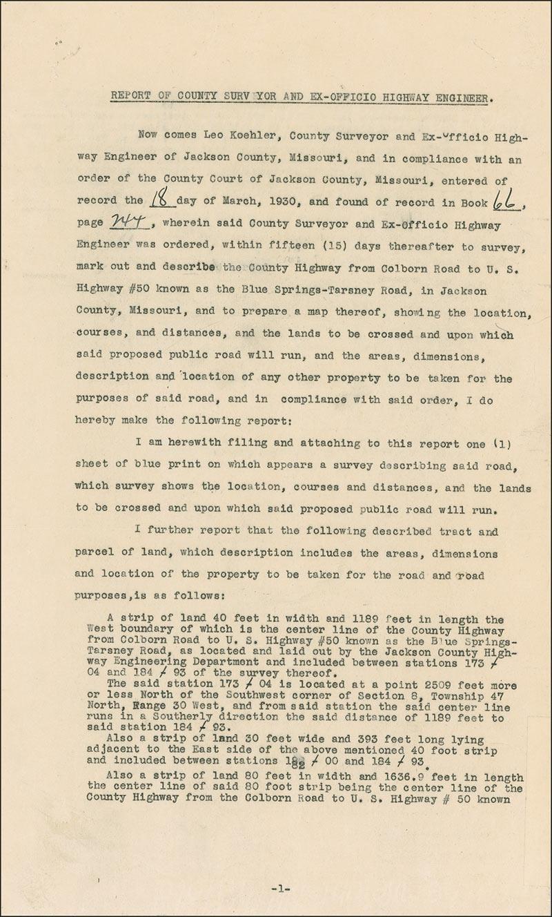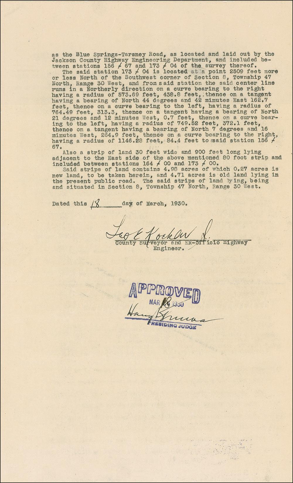DS, two pages, 8.5 x 14, March 18, 1930. A “Report of County Surveyor and Ex-Officio Highway Engineer,” signed by Truman as presiding judge, providing a detailed description of a road and surrounding land. In fine condition, with staple holes to top left and expected document wear. Pre-certified John Reznikoff/PSA/DNA and RRAuction COA.