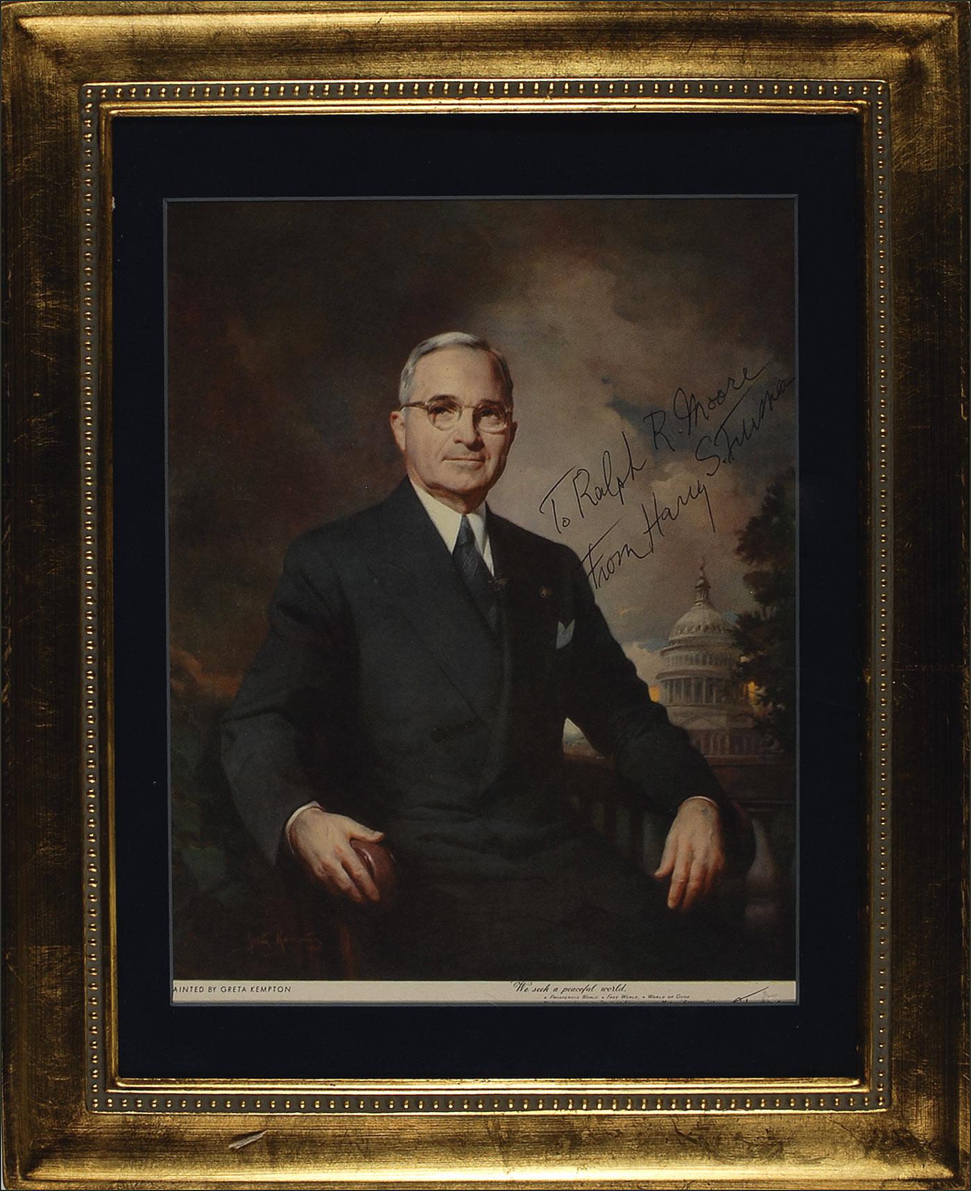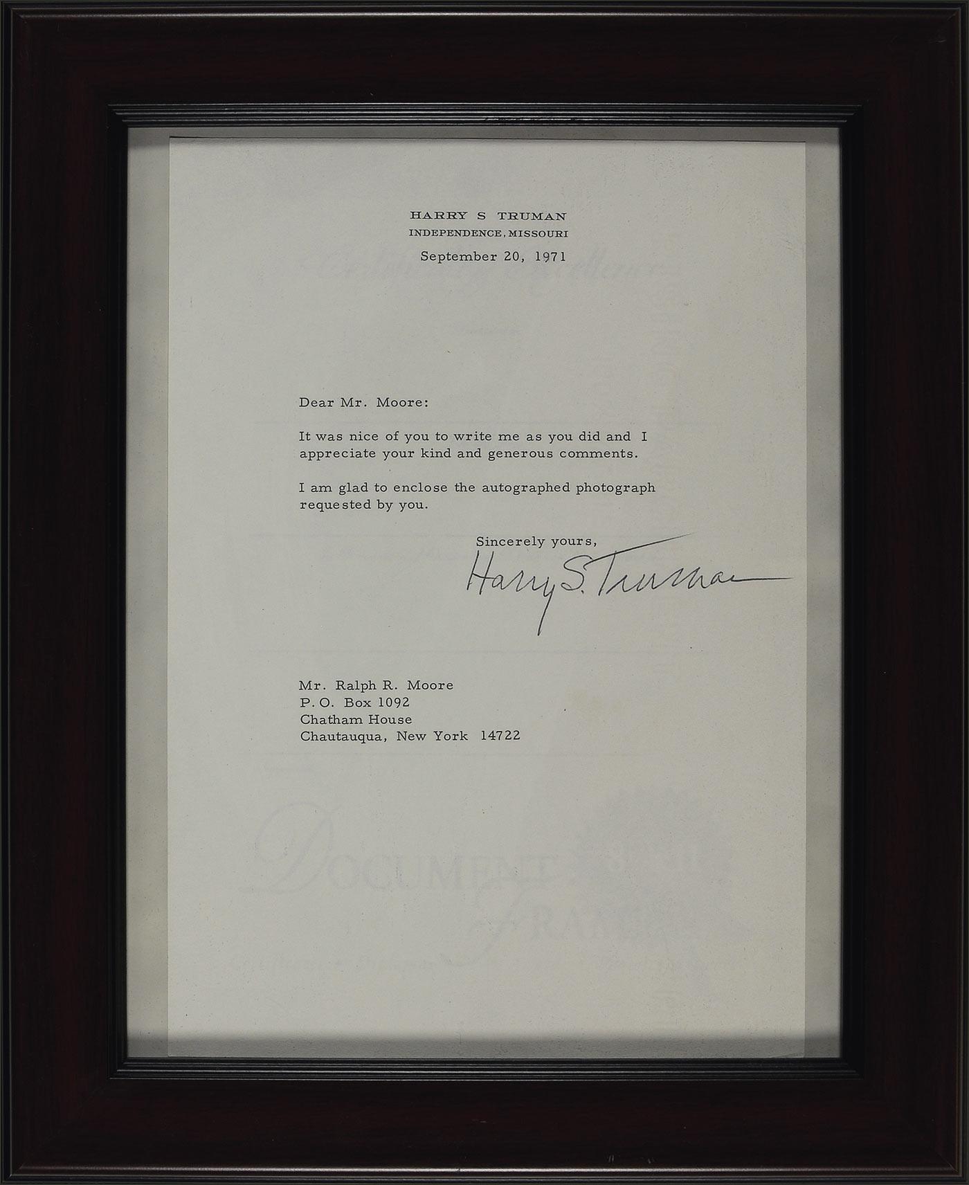 Two items: 8.25 x 10.5 color print of Truman with the Capitol building in the background, signed and inscribed in black ballpoint, “To Ralph R. Moore from Harry S. Truman.” Matted and framed to an overall size of 13 x 16; and a one page TLS, 7.25 x 10.5, dated September 20, 1971, on his personal letterhead, responding to a request by Mr. Moore. In full: “It was nice of you to write me as you did and I appreciate your kind and generous comments. I am glad to enclose the autographed photograph requested by you.” Framed to an overall size of 11.25 x 13.5. In fine condition.