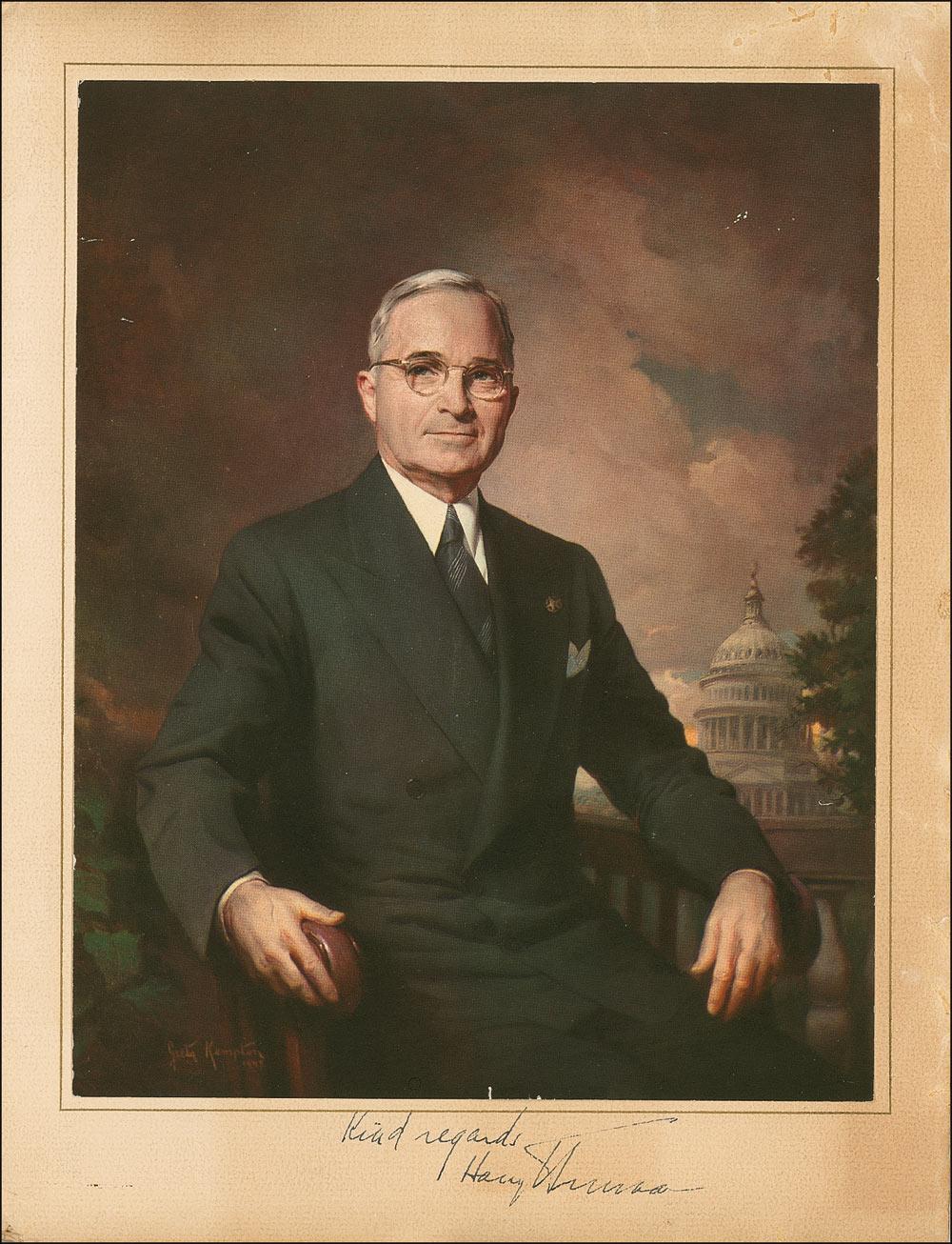 Program for the November 29, 1955, fundraiser for the Harry S. Truman Library Fund at the Fairmont Hotel in San Francisco, 10 x 13, signed in blue ballpoint on the front cover “Kind regards, Harry S. Truman” beneath a color portrait. In very good condition, with a few scattered creases, light skipping to the signature, and overall somewhat irregular toning. Accompanied by an contribution form and mailing envelope for the library fund.