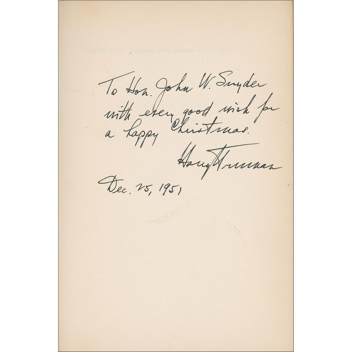 Hardcover and leatherbound copy of Truman’s Address at the Conference on the Japanese Peace Treaty, which he gave on September 4, 1951. Hardcover, 6.5 x 9.5, 12 pages. Sixty copies of this speech were made in this fashion, with this copy being #6, and some were given as Christmas gifts in 1951. Signed and inscribed as president in black ink on the first free end page, “To Hon. John W. Snyder, with every good wish for a happy Christmas, Harry S. Truman, Dec 25, 1951.”