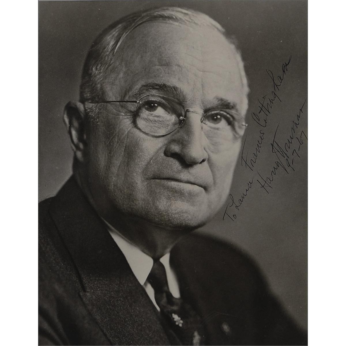 Vintage matte-finish 7.25 x 9.25 photo, signed and inscribed in black ballpoint “To Laura Frances Cothingham, Harry S. Truman 9-7-67.” Double suede matted and framed to an overall size of 12 x 16.25. In fine condition.