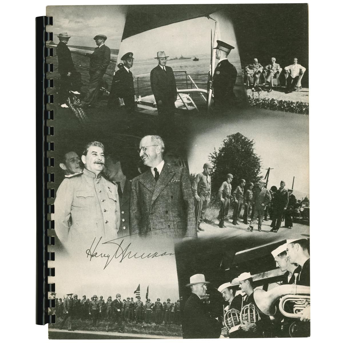 Rare signed spiral-bound book: Log of the President’s Trip to the Berlin Conference (July 6, 1945 to August 7, 1945). Softcover, 9 x 10.75, 140 pages. Signed in black ink on the front cover by Truman under a photo of the president posing with Stalin. Book contains a two-page 15.5 x 10.75 fold-out map charting Truman’s trip. Historic photographs in the “Log” include Truman at the destroyed Reichschancellery in Berlin, Truman with Generals Eisenhower and Patton, Truman and Churchill, Truman with Churchill and Stalin, Truman with Attlee and Stalin, and Truman and King George VI. In fine condition, with mild handling wear.
