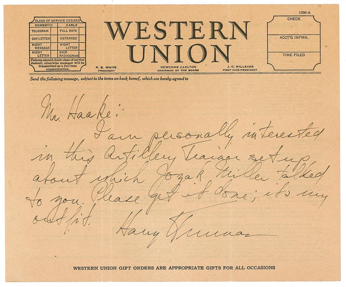 ALS, one page, 8.5 x 7, Western Union letterhead, no date. Letter to Mr. Haake. In full: “I am personally interested in this Artillery Trainer set up about which Jozak Miller talked to you. Please get it done; its my outfit.” In fine condition, with two vertical folds, one through a single letter of signature, a few creases, and a uniform shade of mild toning.