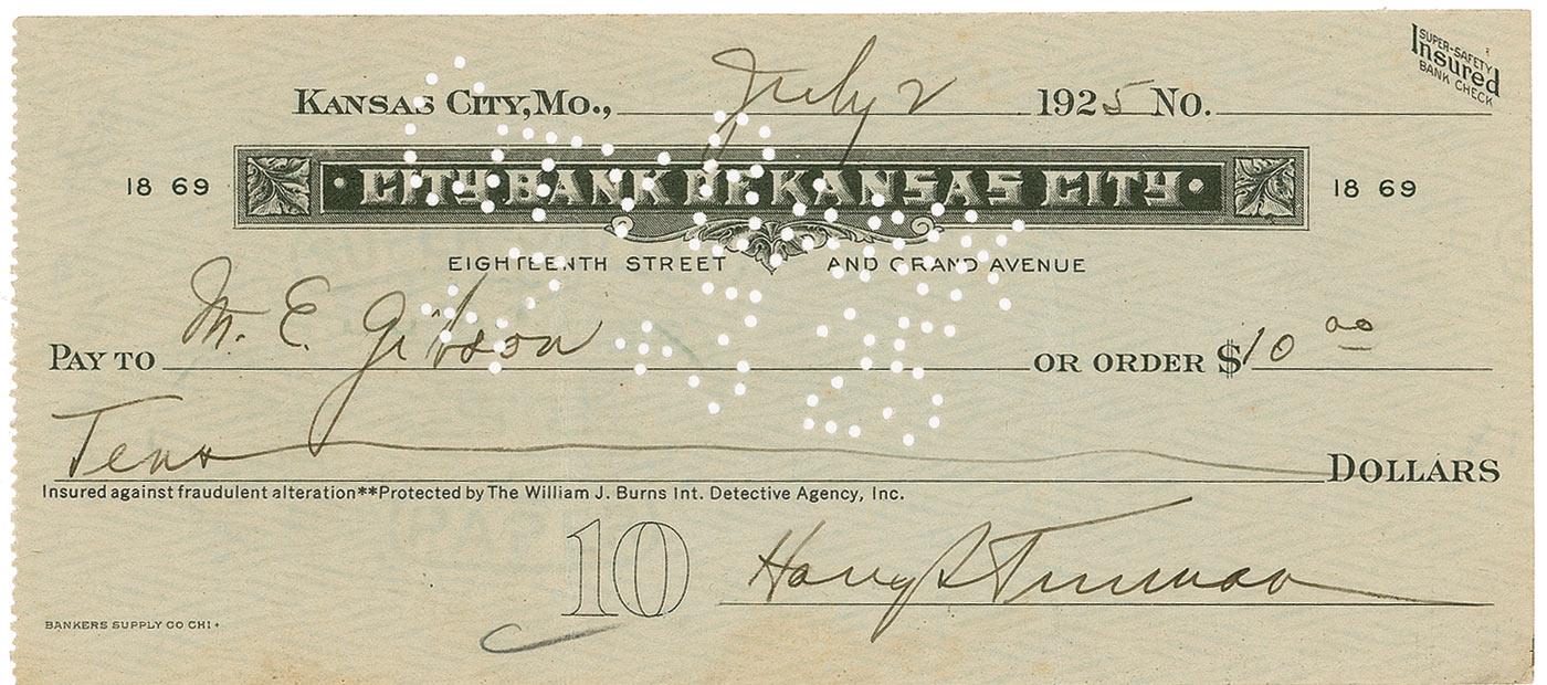 Bank check, 6.25 x 2.75, filled out in another hand and signed by Truman, payable to M. E. Gibson for $10.00, July 2, 1925. Two vertical folds, one through a letter of the signature, expected bank cancellation stamps and holes, and a bit of toning under the signature, otherwise fine condition.
