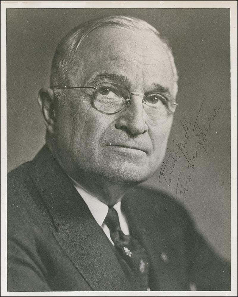 Vintage matte-finish 8 x 10 head-and-shoulders photo, signed and inscribed in black ink “To Dale Grubb, from Harry S. Truman.” In very good condition, with rippling to all four edges.
