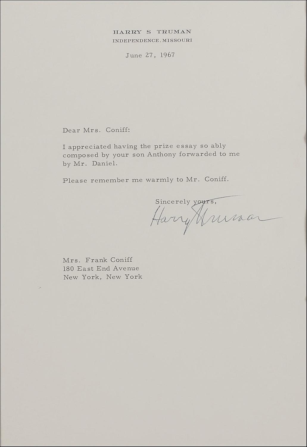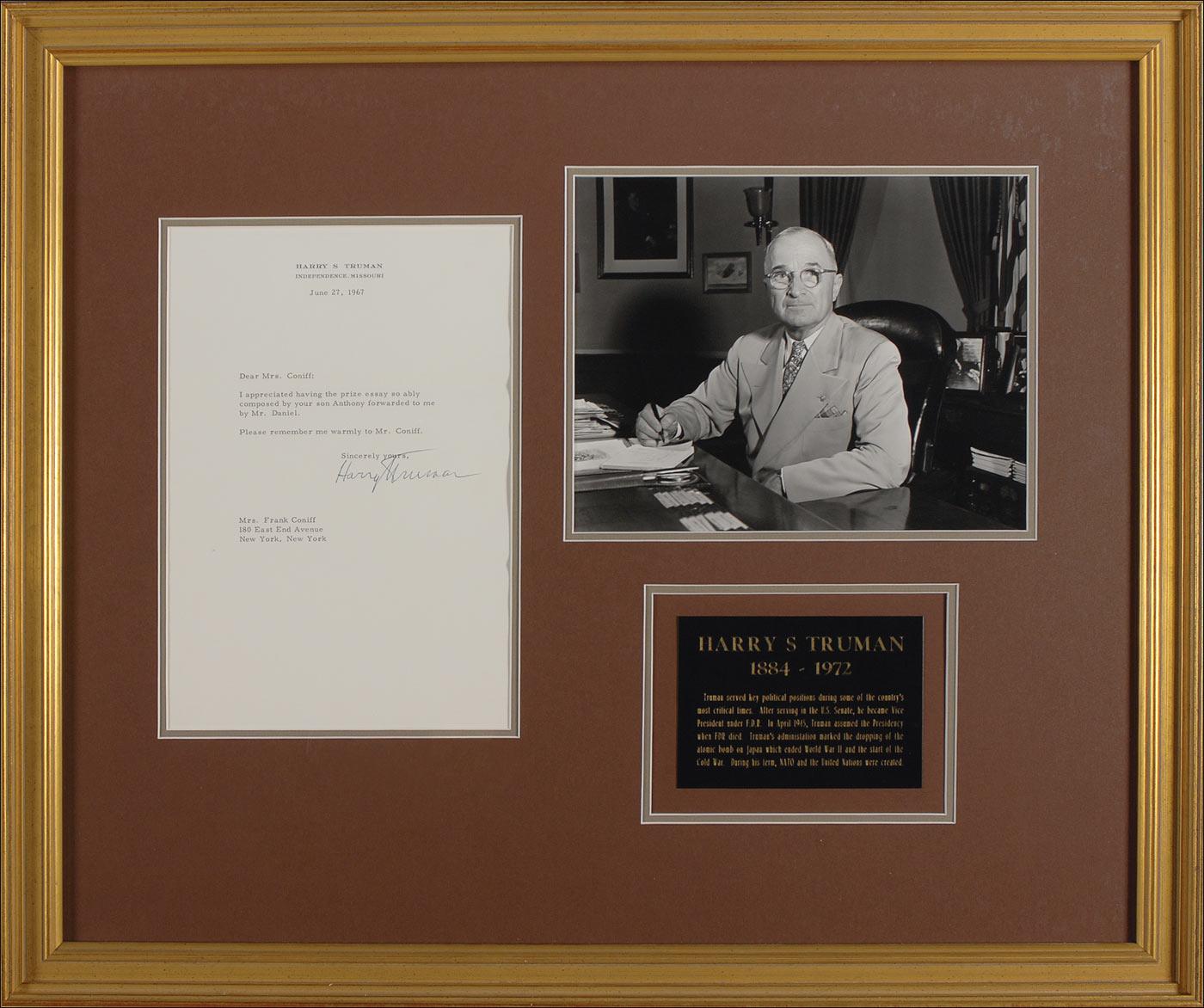 TLS, one page, 7 x 10, personal letterhead, June 27, 1967. Brief letter of congratulations to Frank Coniff. In part: “I appreciated having the prize essay so ably composed by your son Anthony forwarded to me by Mr. Daniel.” Archivally double matted and framed, with a portrait of Truman and a biographical plaque, to an overall size of 24.5 x 20.5. In fine condition. Oversized.