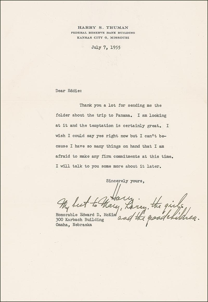 TLS signed “Harry,” one page, 7.25 x 10.5, personal letterhead, July 7, 1955. Truman sends a thank-you note to Edward D. McKim. In full: “Thank you a lot for sending me the folder about the trip to Panama. I am looking at it and the temptation is certainly great. I wish I could say yes right now but I can’t because I have so many things on hand that I am afraid to make any firm commitments at this time. I will talk to you some more about it later.” He has added the postcript: “My best to Mary, Larry, the girls and the grandchildren.” In fine condition, with a mailing fold passing through the first line of his postscript. Accompanied by the original mailing envelope.