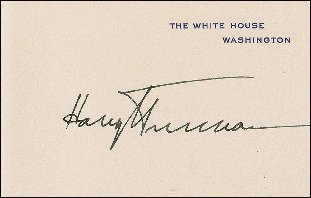 Signed White House card, boldly signed in black ink, “Harry S. Truman.” In fine condition.